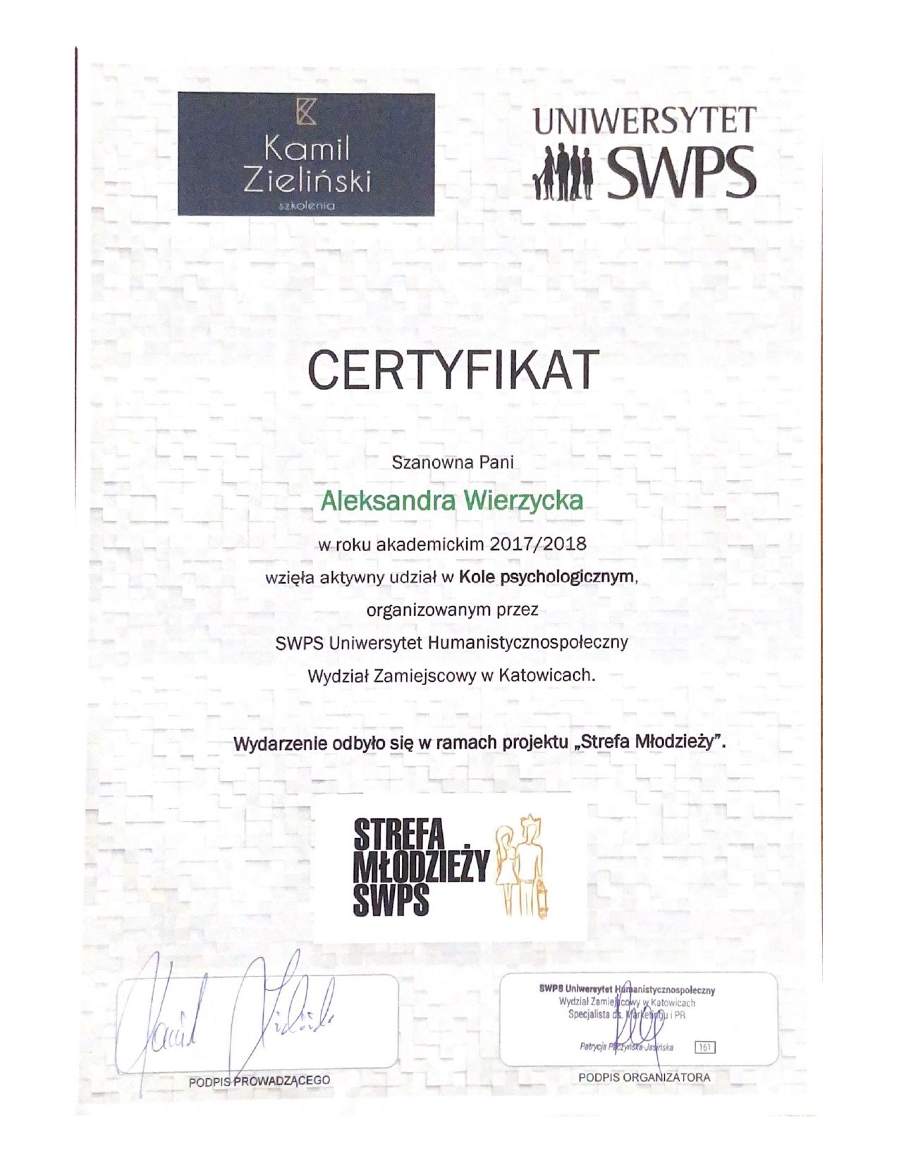 Jestem psycholożką, absolwentką Uniwersytetu SWPS ze specjalnością w psychologii klinicznej człowieka dorosłego. Ukończyłam szkolenie z zakresu Treningu Umiejętności Społecznych. Doświadczenie zawodowe zdobywałam między innymi w Poradni Zdrowia Psychicznego w Katowicach oraz w Środowiskowym Domu Samopomocy AD VITAM DIGNAM. Odbyłam również staż w Centrum Psychiatrii w Katowicach, na Oddziale Ogólnopsychiatrycznym.