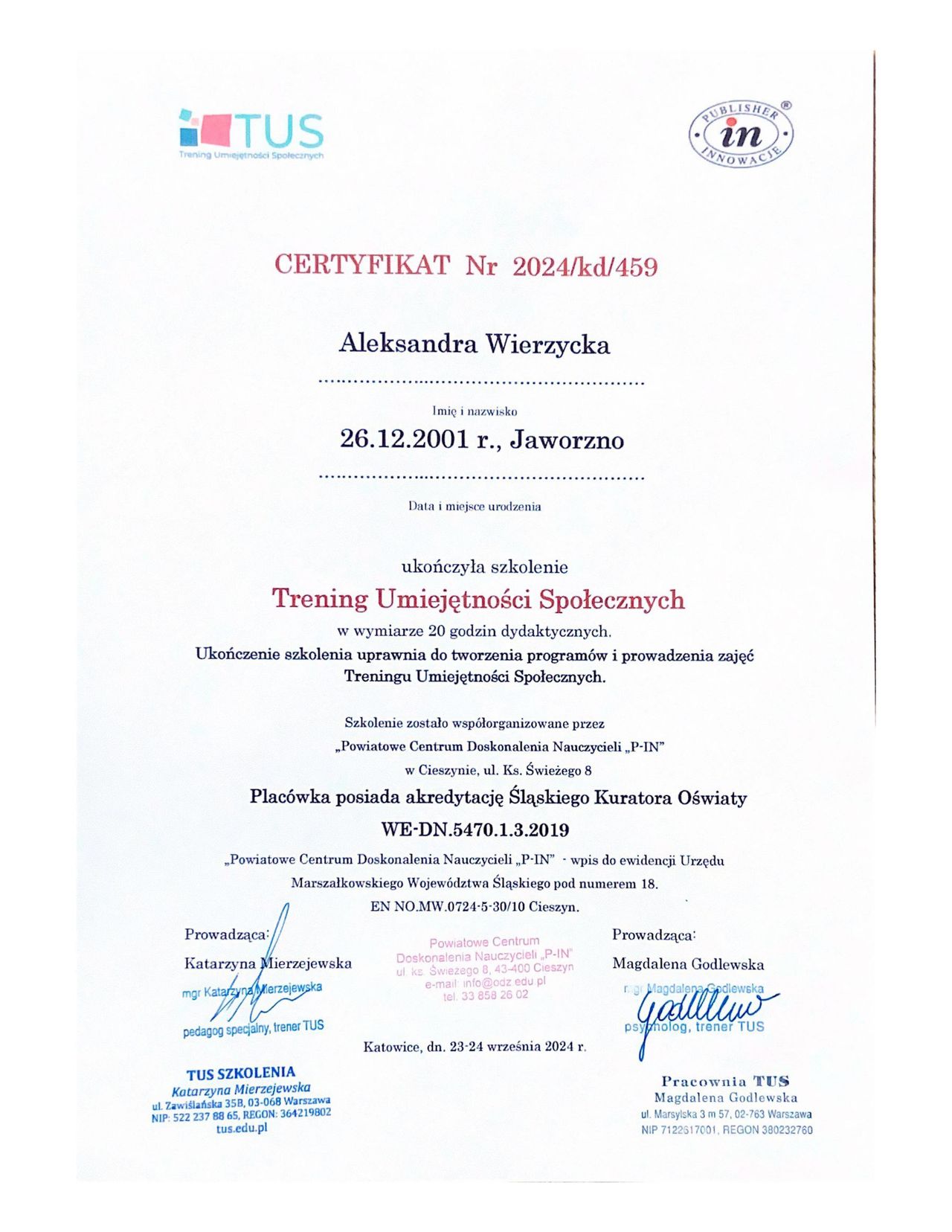Regularnie poddaję swoją pracę superwizji oraz podlegam terapii własnej. Posiadaną wiedzę systematycznie poszerzam poprzez udział w specjalistycznych kursach, szkoleniach i konferencjach naukowych.