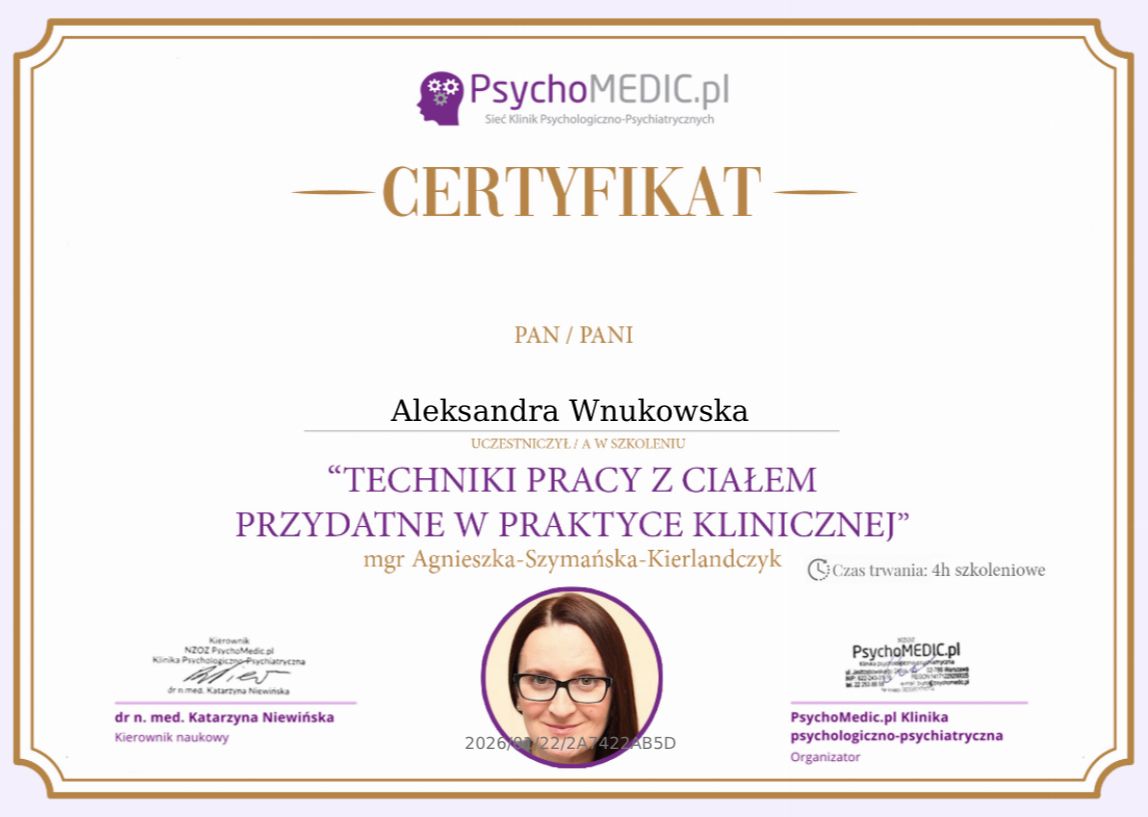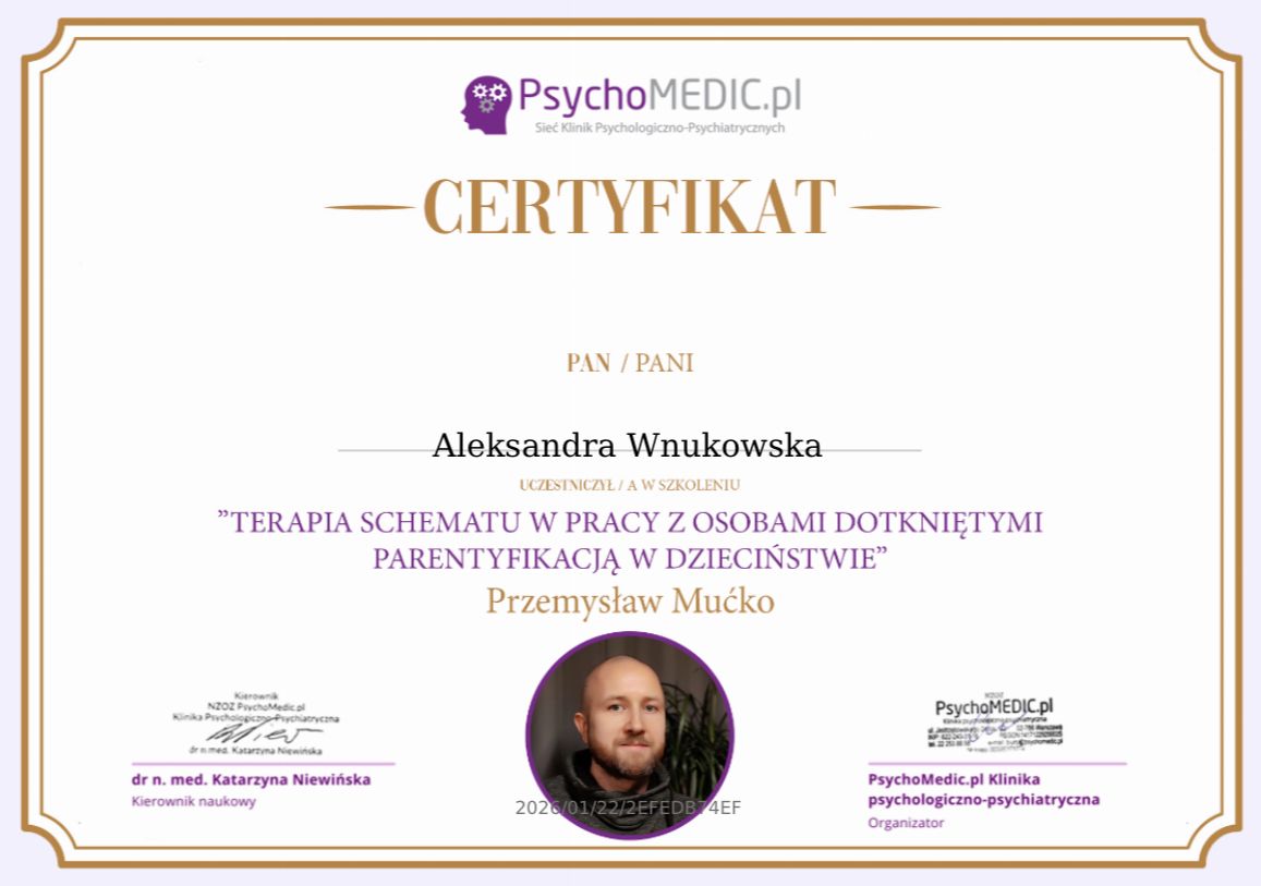 Pani Aleksandra jest niezwykle empatyczna i uważna na potrzeby pacjenta. Potrafi stworzyć bezpieczną, pełną zaufania atmosferę, dzięki czemu łatwo się otworzyć. Jej wsparcie i trafne spostrzeżenia realnie pomagają w zrozumieniu siebie i radzeniu sobie z trudnościami.