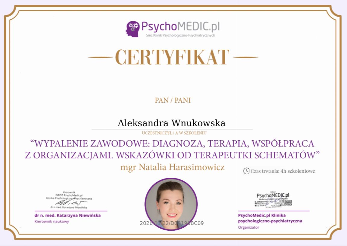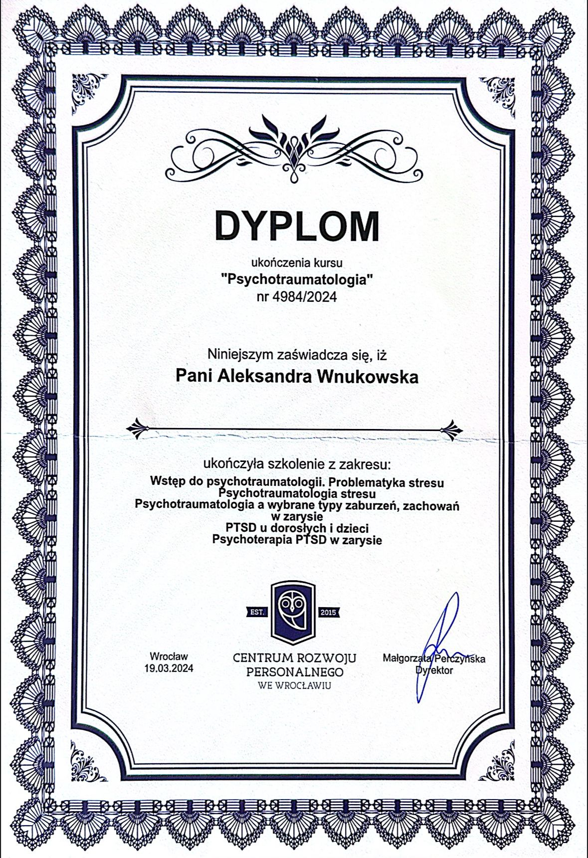 Ukończyłam studia I i II stopnia zyskując tym samym pełne wykształcenie psychologiczne (WSB w Poznaniu - studia licencjackie, Uniwersytet SWPS we Wrocławiu - studia magisterskie). Obecnie poszerzam swoje kompetencje, studiując podyplomowo Psychotraumatologię na Uniwersytecie SWPS w Katowicach oraz regularnie uczestnicząc w szkoleniach i webinarach.