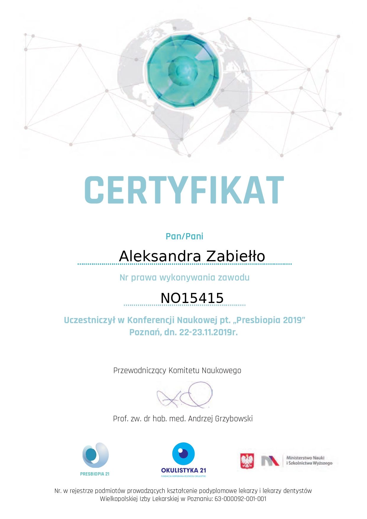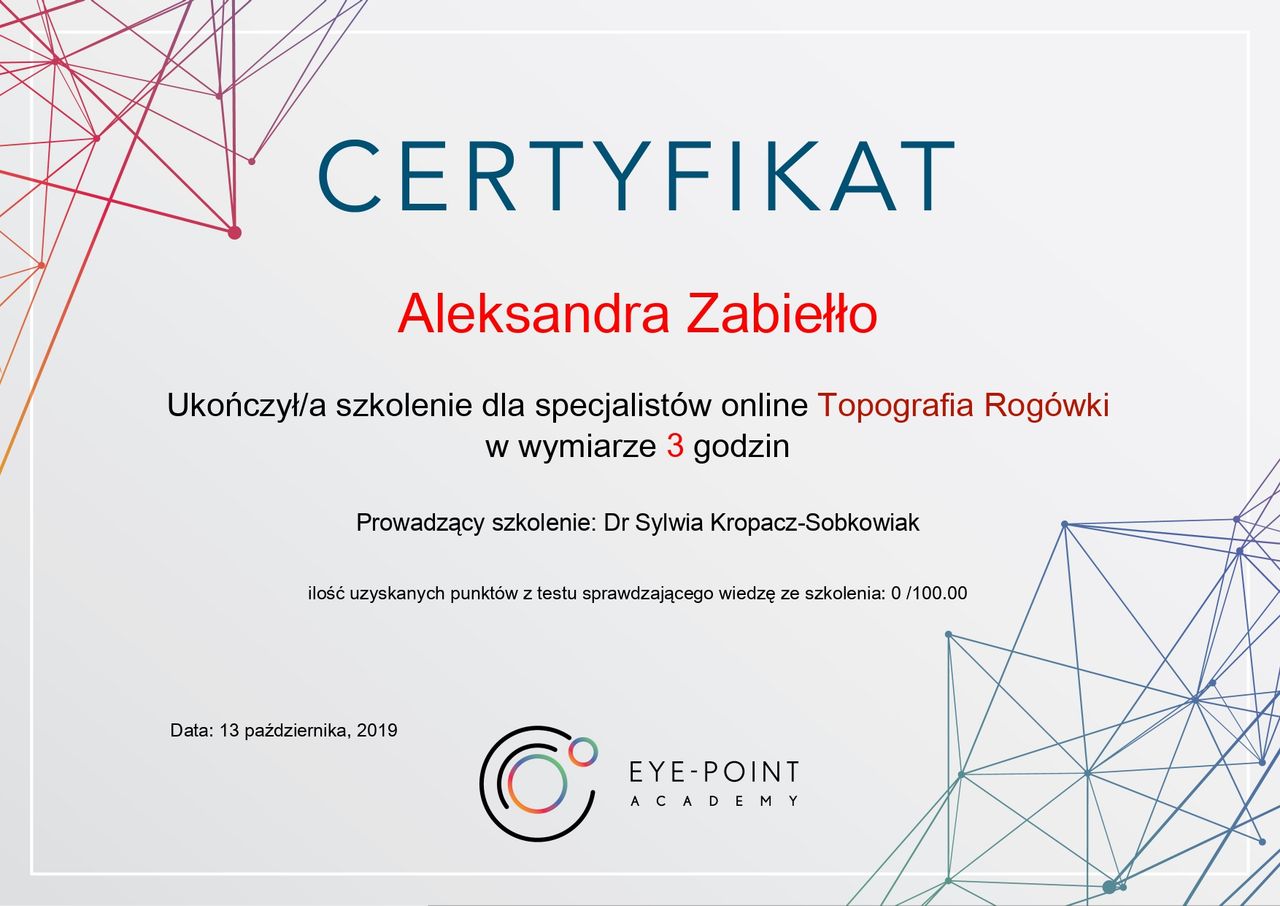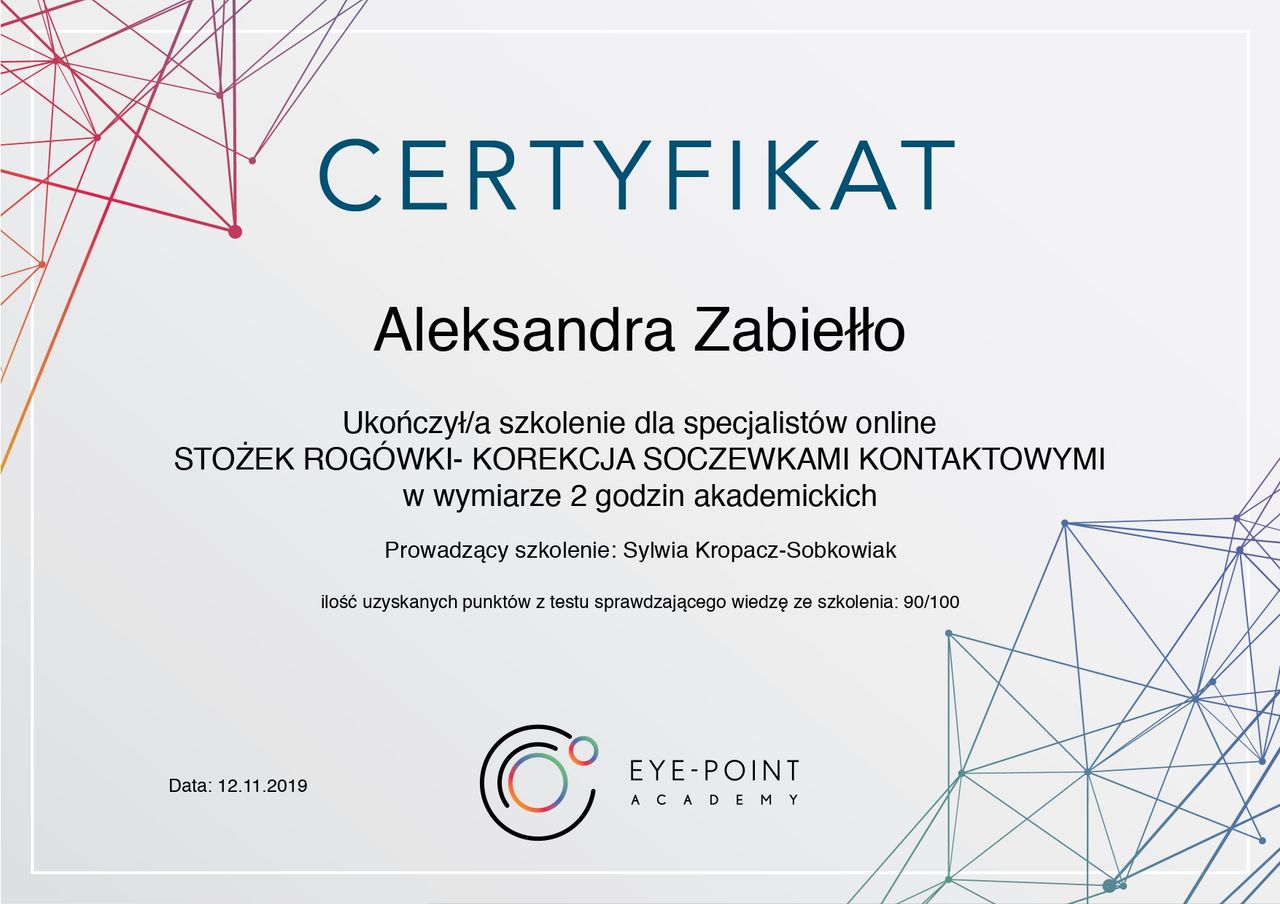 Jaki jest zakres porad oferowanych przez Aleksandra Zabiełło?Aleksandra Zabiełło to optometrysta. Na podstawie swojego doświadczenia i wykształcenia Aleksandra Zabiełło oferuje usługi takie jak: Badanie wzroku + dobór okularów, Badanie oraz dobór soczewek kontaktowych, Wizyta kontrolna po badaniu wzroku, badanie wzroku u dzieci, Badanie wzroku dzieci z doborem soczewek kontaktowych, Wizyta kontrolna dzieci po badaniu wzroku.