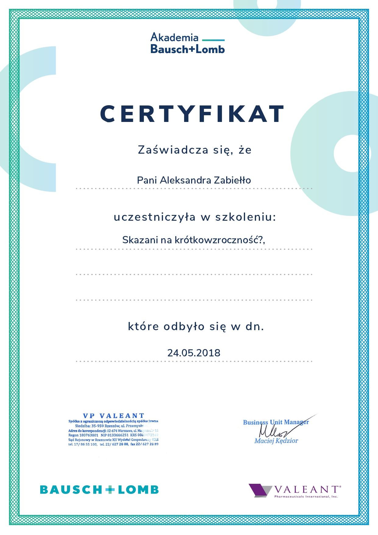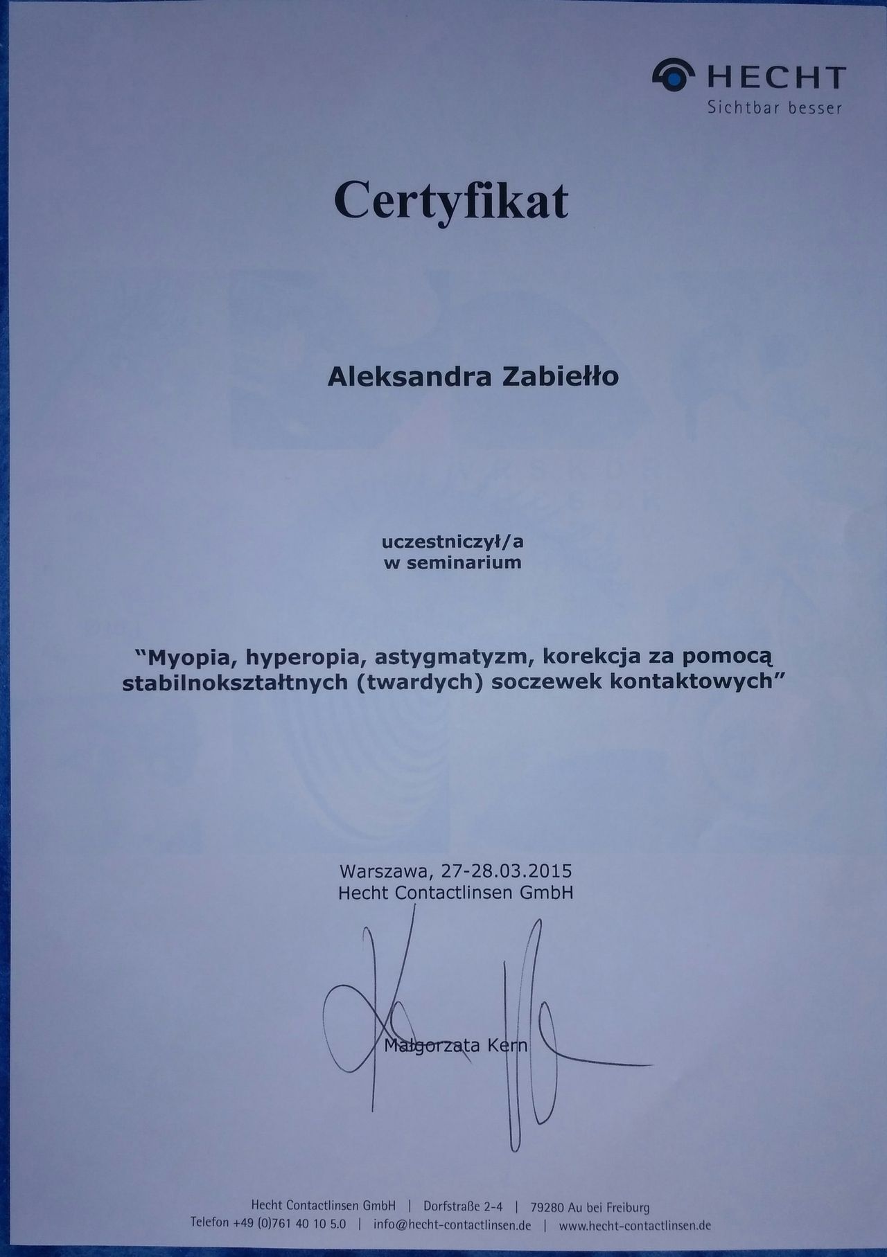 Jestem po dwóch wizytach u Pani Aleksandry. Szczerze polecam. Pani Aleksandra jest sympatyczną osobą o wysokiej kulturze osobistej, a przede wszystkim jest osobą o ogromnej wiedzy. Do każdej osoby podchodzi indywidualnie - szczegółowo badając moje oczy zwróciła uwagę na coś, o czym nikt nigdy wcześniej mi nie wspomniał… Mimo dużej wady z astygmatyzmem mam idealnie dobrane soczewki