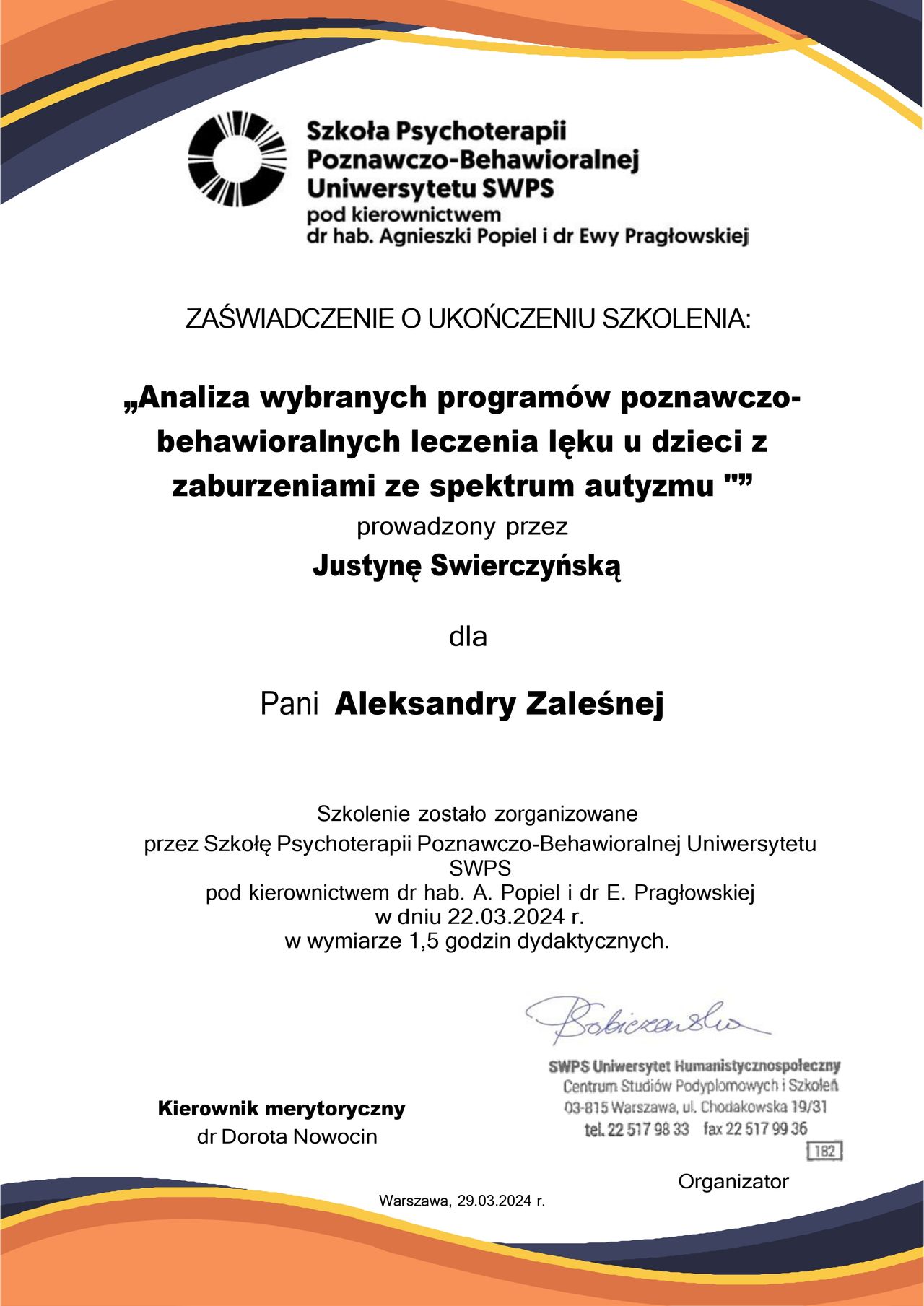 Czy Aleksandra Zaleśna przyjmuje online, bez konieczności pojawiania się w placówce?Tak, Aleksandra Zaleśna oferuje konsultacje online. Wybierz opcję „konsultacja online” przy umawianiu wizyty, a zobaczysz dostępne terminy.