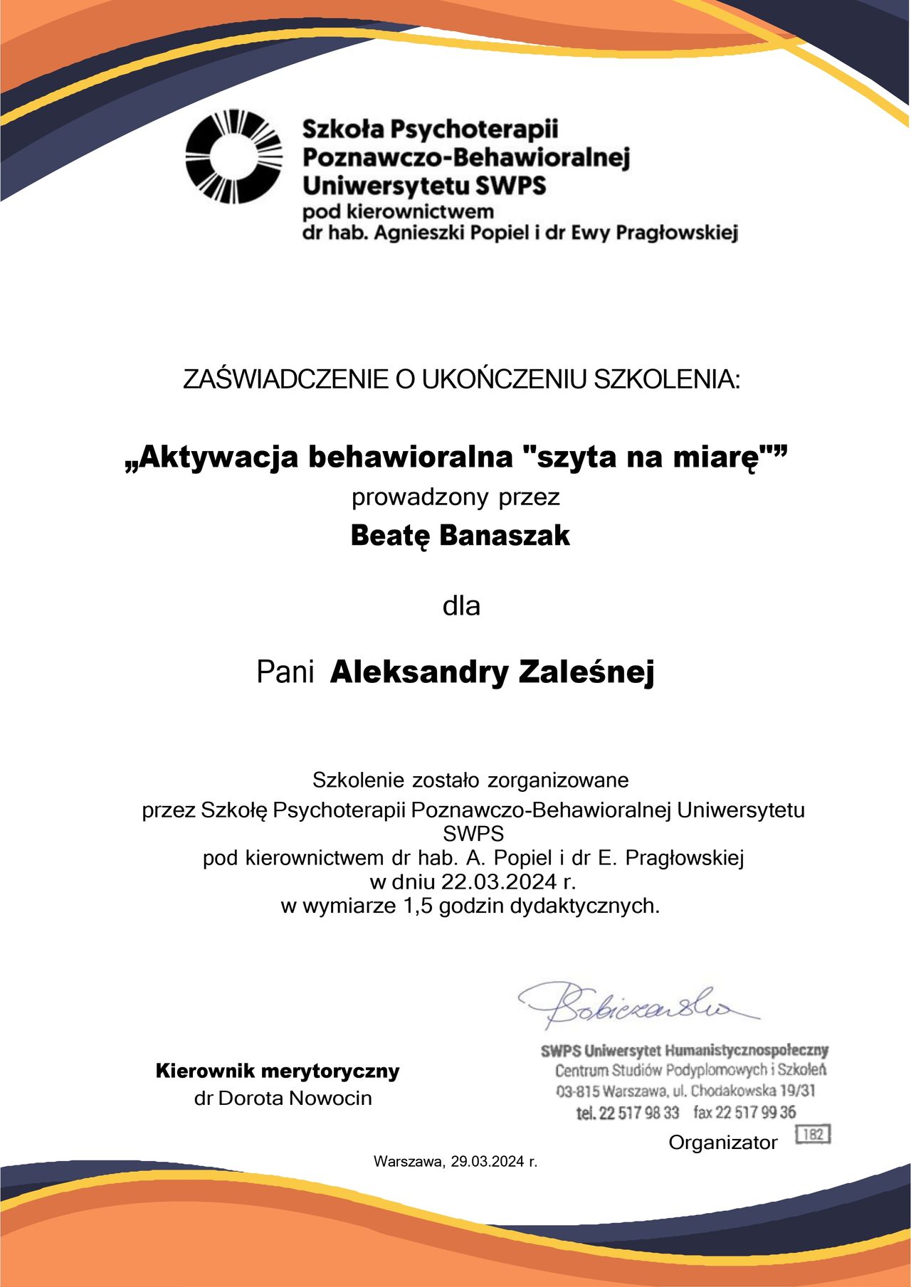 Gdzie Aleksandra Zaleśna ma swój gabinet?Aleksandra Zaleśna przyjmuje pod adresem: