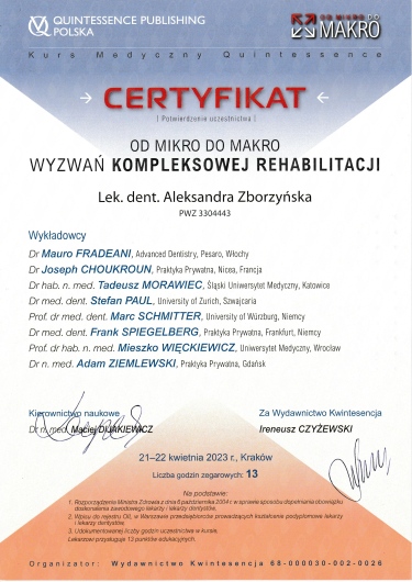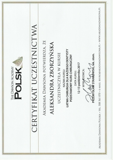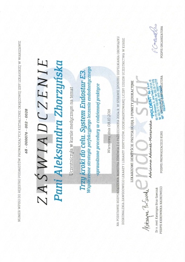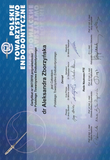 Jaki jest zakres porad oferowanych przez Aleksandra Zborzyńska?Aleksandra Zborzyńska to stomatolog. Na podstawie swojego doświadczenia i wykształcenia Aleksandra Zborzyńska oferuje usługi takie jak: konsultacja protetyczna, konsultacja endodontyczna, leczenie kanałowe pod mikroskopem, Konsultacja stomatologiczna, Leczenie endodontyczne, diagnostyka RTG/CBCT.