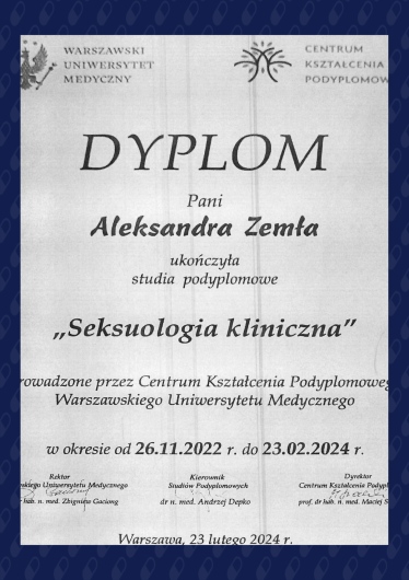Dr Aleksandra Zemła łączy nowoczesną wiedzę medyczną z indywidualnym podejściem do pacjenta, oferując diagnostykę i leczenie oparte na aktualnych standardach urologii, andrologii i seksuologii.