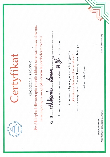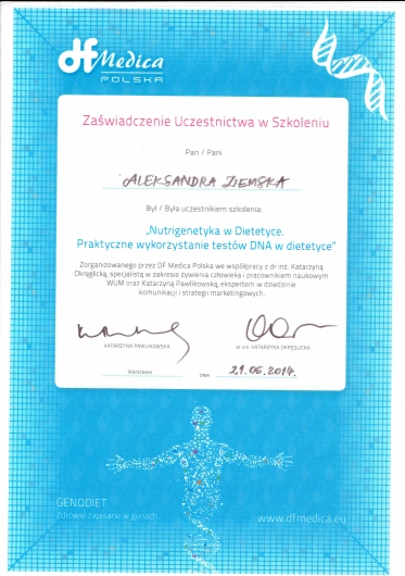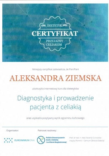 W gabinecie DIETETYK ALEKSANDRA ZIEMSKA - NOVA FIGURA przyjmuje także młodsza specjalistka -dietetyk Aleksandra Janiak. Specjalizuje się w leczeniu dietetycznym chorób układu pokarmowego oraz dolegliwości trawiennych. Doskonale wspomaga także pacjentów z chorobami metabolicznymi. Aleksandra Janiak posiada także przygotowanie merytoryczne do prowadzenia pacjentów onkologicznych. W gabinecie przy Szosie Lubickiej 168 L przyjmuje w piątki od 12:00 -20:00 oraz soboty w godz. 8:00 - 14:00.