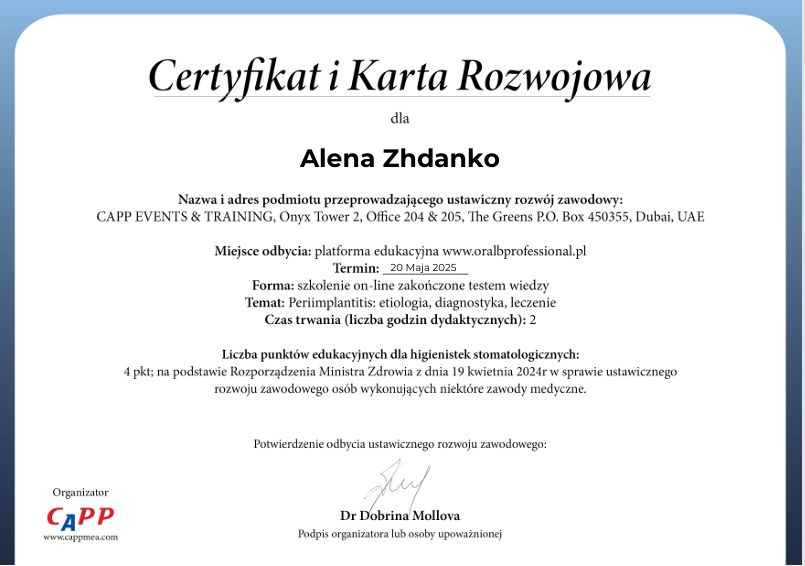 Jaki jest zakres porad oferowanych przez Alena Zhdanko ?Alena Zhdanko to higienistka/higienista stomatologiczny. Na podstawie swojego doświadczenia i wykształcenia Alena Zhdanko oferuje usługi takie jak: higienizacja, Regeneracyjne wybielanie zębów, scaling + piaskowanie, fluoryzacja zębów, scaling, piaskowanie.