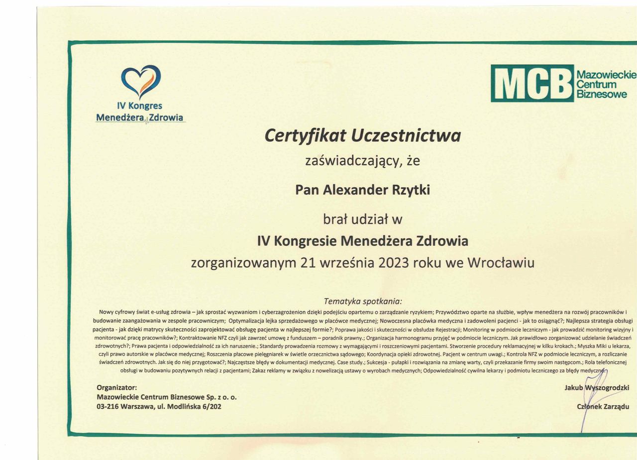Czy Alexander Rzytki przyjmuje online, bez konieczności pojawiania się w placówce?Tak, Alexander Rzytki oferuje konsultacje online. Wybierz opcję „konsultacja online” przy umawianiu wizyty, a zobaczysz dostępne terminy.