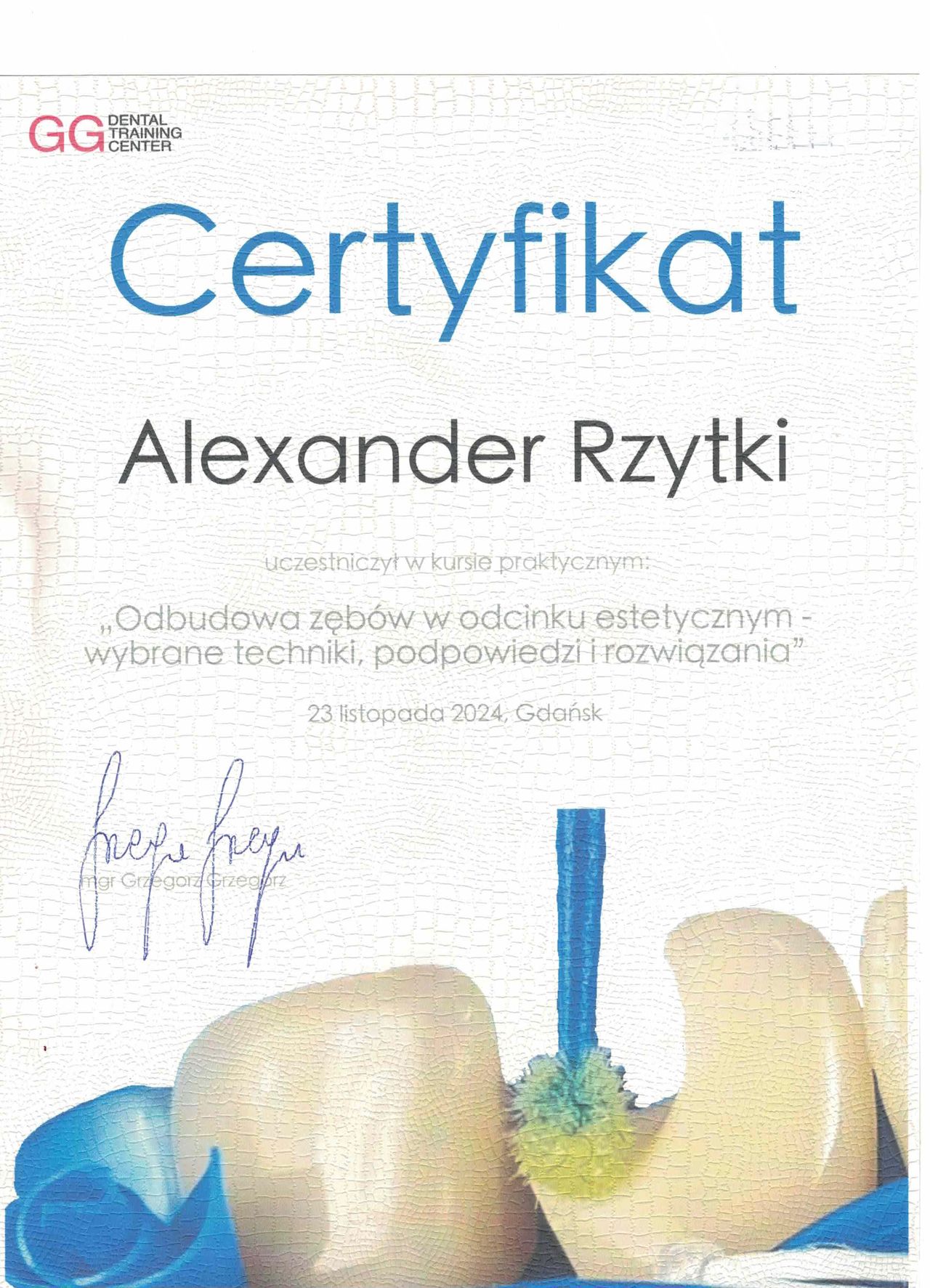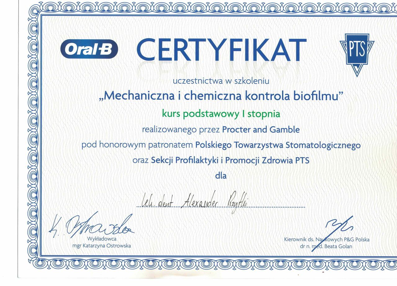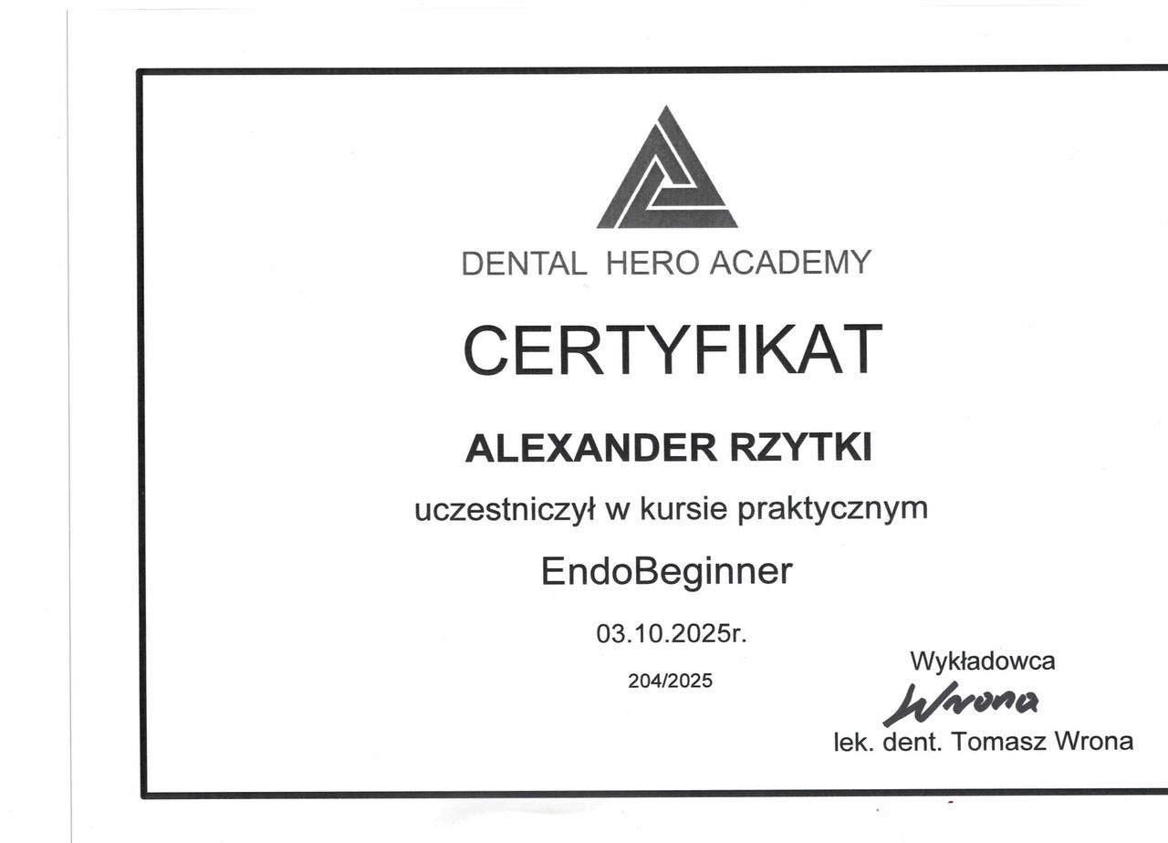 Nazywam się Alexander Rzytki i jestem lekarzem dentystą. Ukończyłem Gdański Uniwersytet Medyczny – jedną z czołowych uczelni medycznych w Polsce. Od początku swojej pracy przyświeca mi jedna myśl: pacjent w gabinecie powinien czuć się bezpiecznie, spokojnie i mieć pewność, że jest w dobrych rękach.