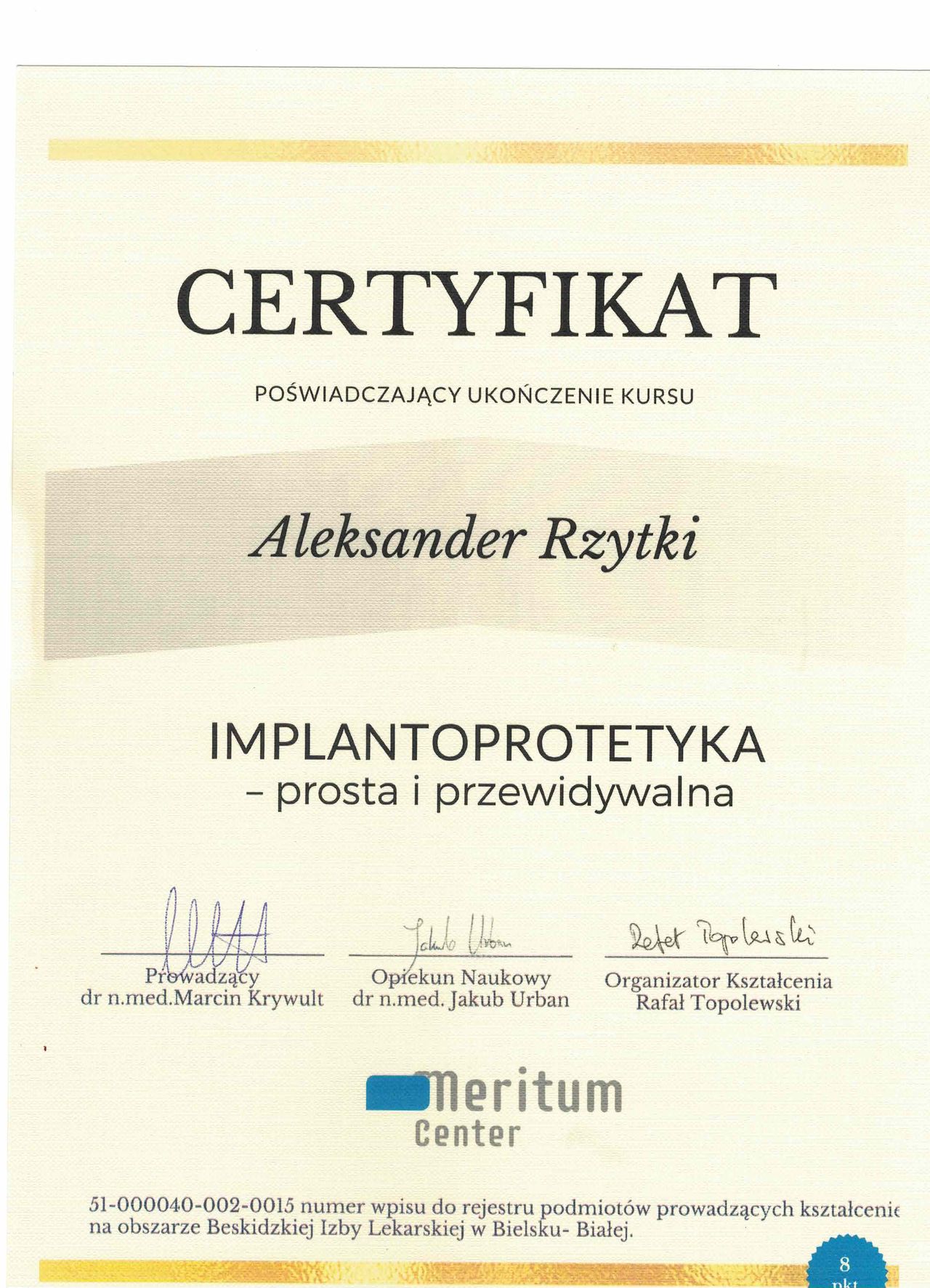 Najwięcej satysfakcji daje mi chirurgia stomatologiczna – usuwanie zębów zatrzymanych czy zabiegi implantologiczne, bo właśnie wtedy mogę realnie poprawić komfort życia moich pacjentów. Jestem uczestnikiem certyfikowanego Curriculum Chirurgiczno-Implantologicznego. Poza chirurgią zajmuję się także implantoprotetyką, protetyką, periodontologią oraz stomatologią zachowawczą.