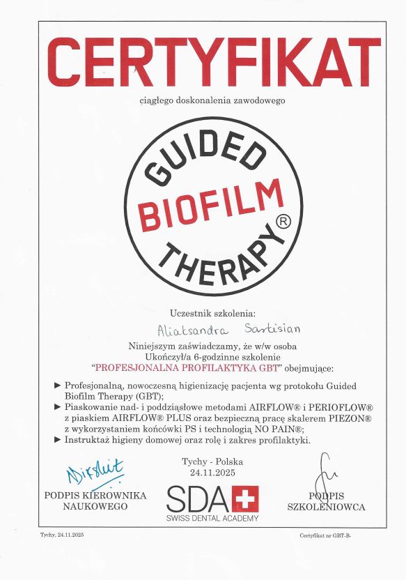 Ukończyłam kurs pracy w systemie GBT (Guided Biofilm Therapy), co pozwala mi pracować nowoczesnymi i skutecznymi metodami profilaktyki stomatologicznej. Stale podnoszę swoje kwalifikacje i rozwijam umiejętności, aby zapewnić pacjentom opiekę na najwyższym poziomie.