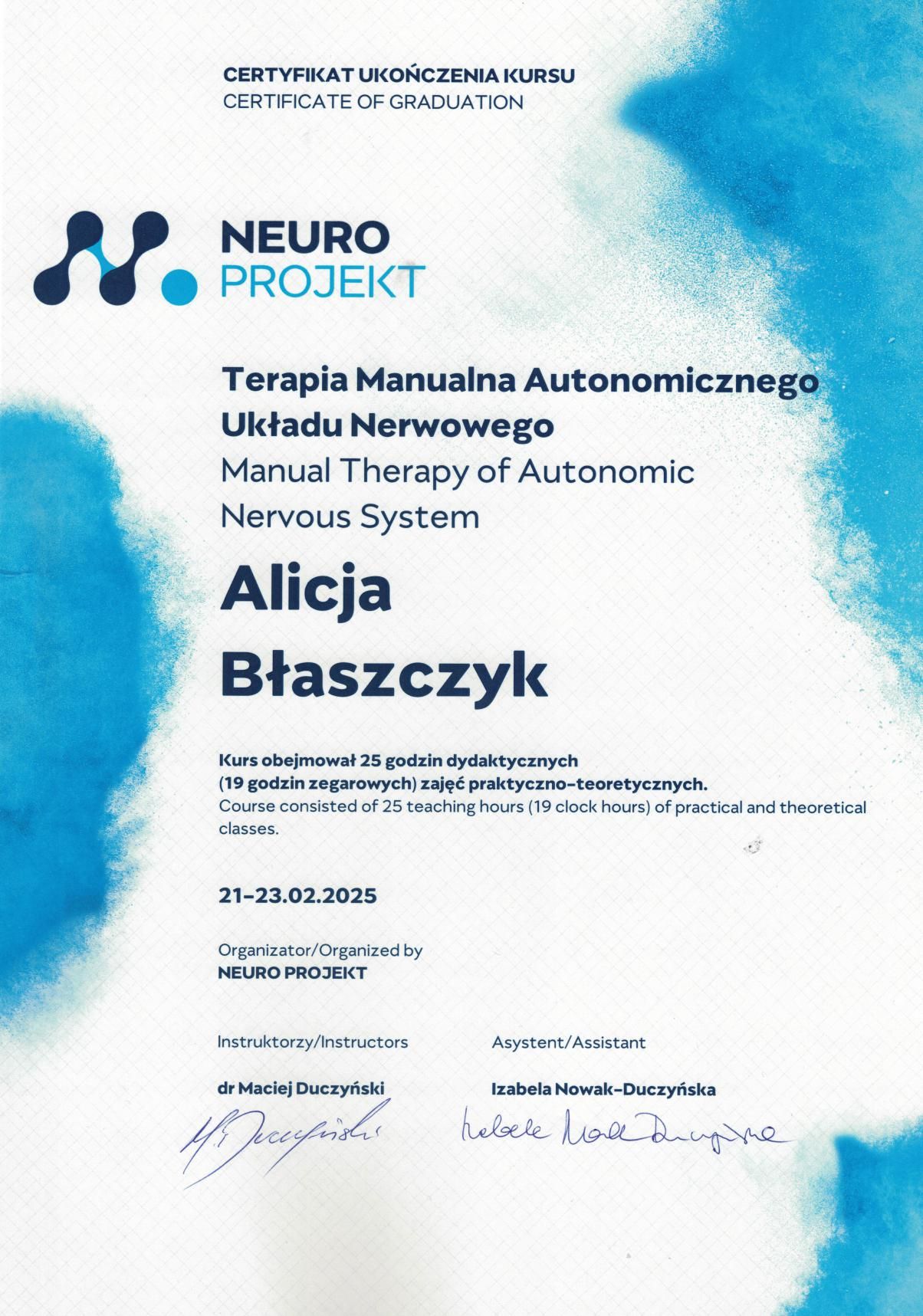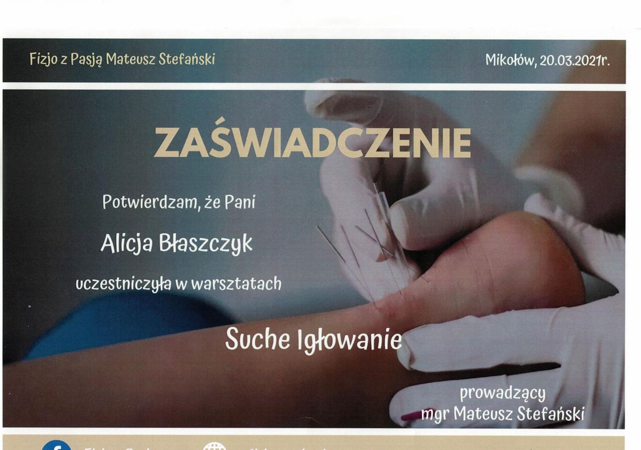 Już po pierwszej wizycie czułam ulgę i mniejsze napięcie w ciele. Pani Alicja jest niezwykle sympatyczna, zaangażowana w pomoc pacjentowi z profesjonalnym podejściem. Serdecznie polecam każdemu, kto boryka się z bólem. :)