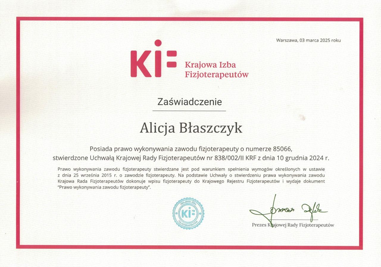 Jaki jest zakres porad oferowanych przez Alicja Błaszczyk?Alicja Błaszczyk to fizjoterapeuta. Na podstawie swojego doświadczenia i wykształcenia Alicja Błaszczyk oferuje usługi takie jak: konsultacja fizjoterapeutyczna.