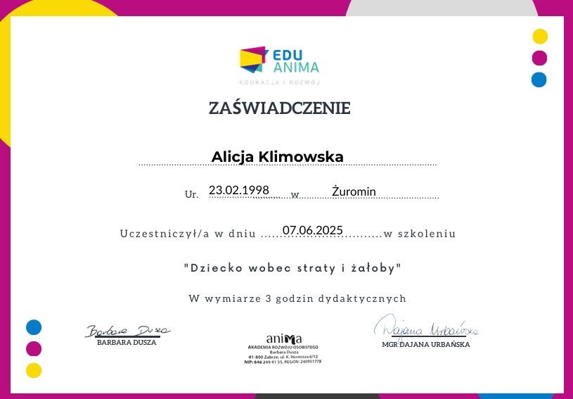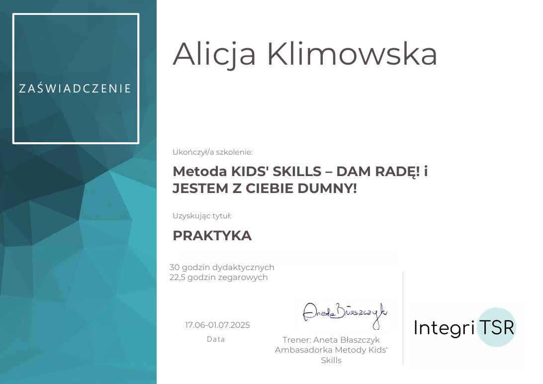 Choć jestem na początku swojej drogi zawodowej, stale się rozwijam – uczestniczę w szkoleniach, poznaję nowe podejścia i pogłębiam swoje kompetencje.