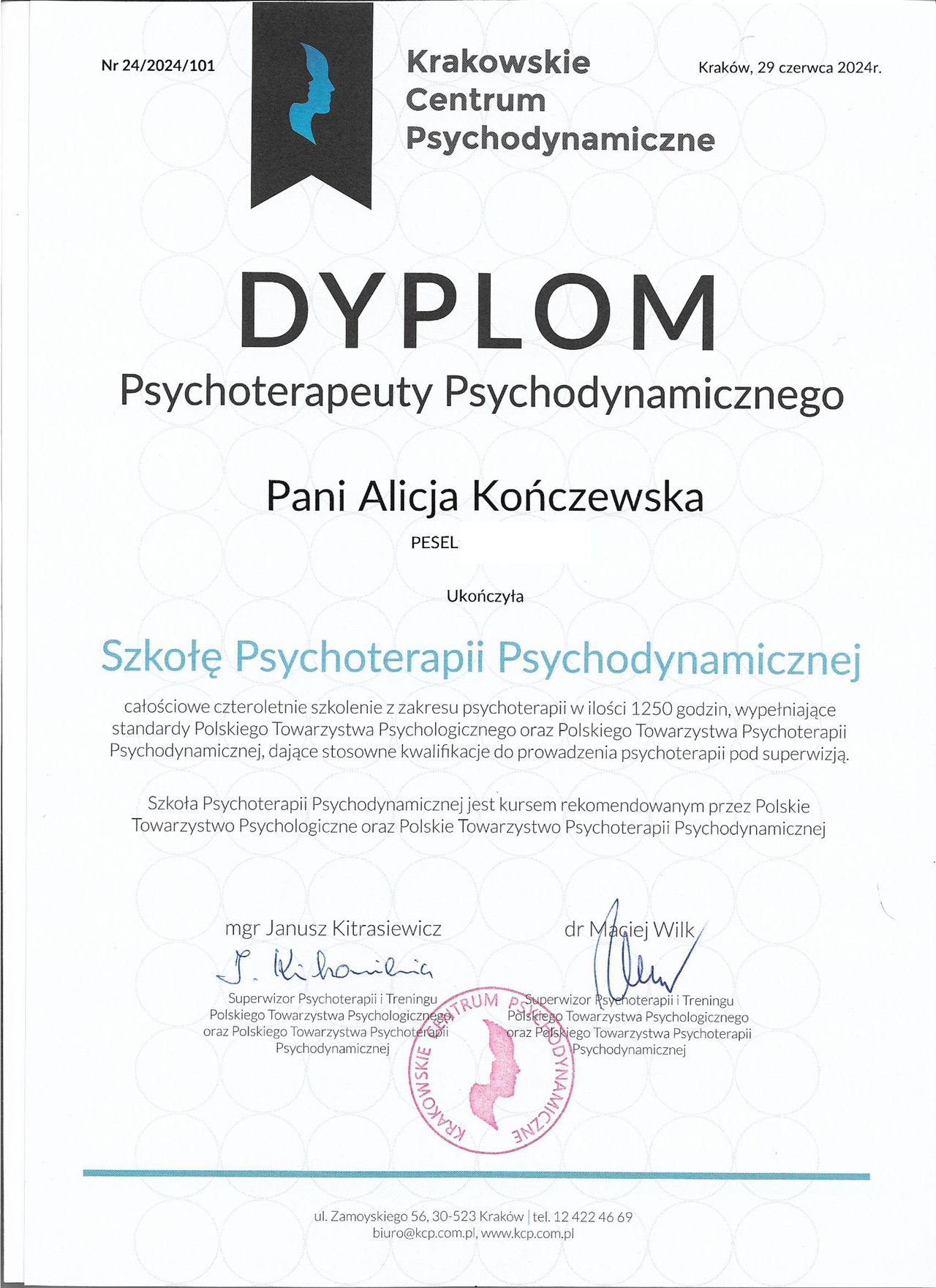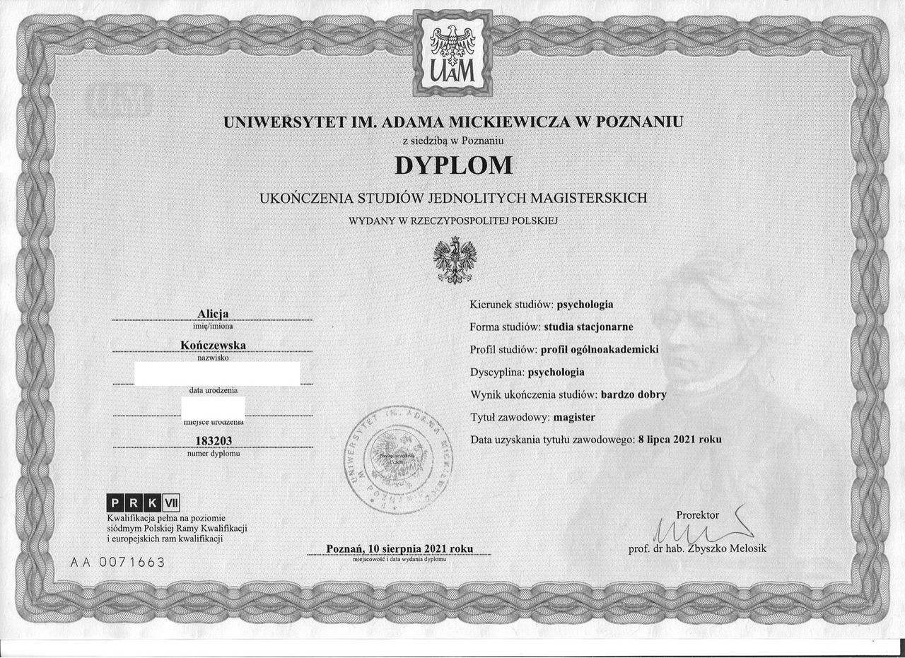 Jestem absolwentką psychologii na Uniwersytecie im. Adama Mickiewicza w Poznaniu oraz Szkoły Psychoterapii w Krakowskim Centrum Psychodynamicznym.