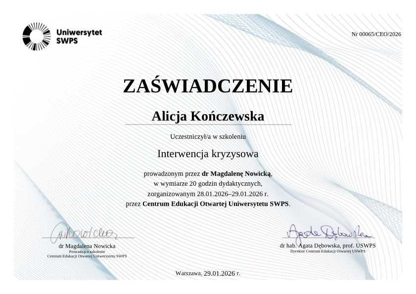 Chodziłam do Pani Alicji przez ponad pół roku. Z każdym spotkaniem czułam się coraz bezpieczniej i swobodniej, dzięki czemu mogłam poruszać ciężkie dla mnie tematy. Czułam się w pełni zrozumiana. Dzięki Pani Alicji nauczyłam się w nowy sposób postrzegać moje emocje i samopoczucie, nie czuję się już tak zagubiona jak wcześniej. Wiem też z czym dalej mogę pracować i na jakie obszary zwrócić uwagę, aby kontynuować pozytywne zmiany jakie udało nam się rozpocząć :)