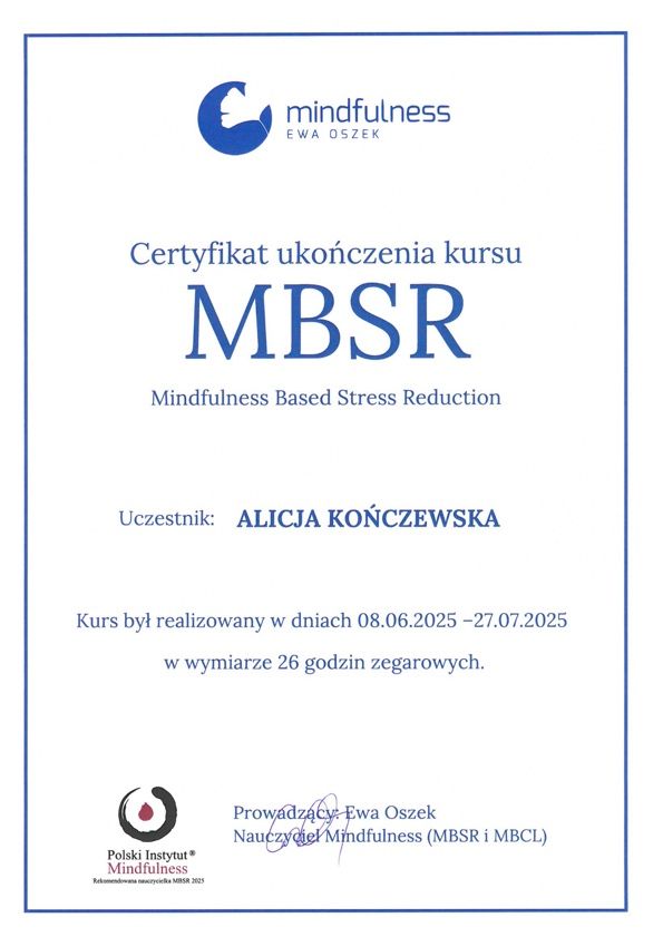 Systematycznie rozwijam swoje zainteresowania i umiejętności związane z praktyką uważności - metodą o potwierdzonym naukowo, pozytywnym wpływie na zdrowie psychiczne. Ukończyłam certyfikowany kurs MBSR (Mindfulness-Based Stress Reduction), a obecnie uczestniczę w Programie Praktyki Formalnej Polskiego Instytutu Mindfulness.