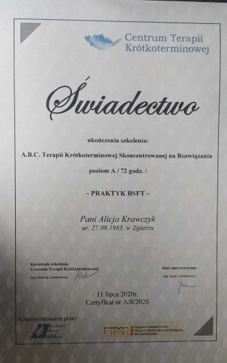 Pani Alicja to wyjątkowo empatyczna i pomocna osoba, która zawsze jest punktualna. Dzięki jej wsparciu i umiejętności słuchania, zmieniłam sposób postrzegania wielu sytuacji. Jej zaangażowanie w terapię jest nieocenione, a pomoc, jaką oferuje, naprawdę robi różnicę! Serdecznie polecam!!! Warto!!!