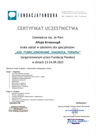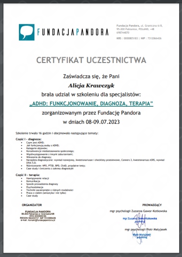 Chciałbym serdecznie podziękować Pani Alicji za ogromne zaangażowanie w cały proces diagnostyki ADHD.