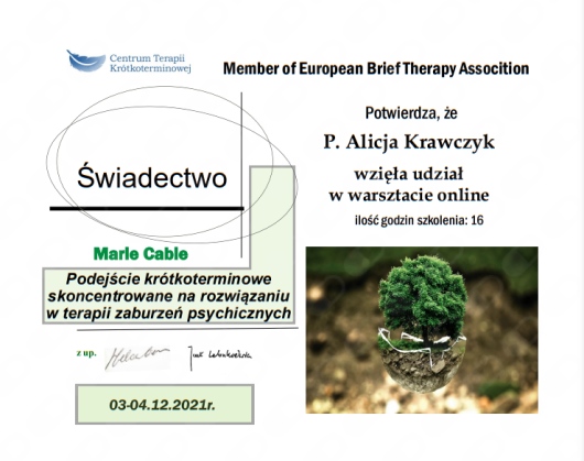 Jestem Psychologiem, Terapeutą Terapii Krótkoterminowej Skoncentrowanej na Rozwiązaniu oraz Doradcą Zawodowym dla młodzieży i dorosłych. Ukończyłam jednolite studia magisterskie na kierunku Psychologia na Uniwersytecie Łódzkim. Uzupełniam swoją wiedzę dodatkowo uczestnicząc w kursach i szkoleniach. Doświadczenie w pracy psychologa czy Doradcy Zawodowego zdobywałam pracując w Stowarzyszeniu Ja-Ty-My oraz w Miejskim Ośrodku Pomocy Społecznej, gdzie prowadziłam warsztaty, konsultacje indywidualne, wparcie w poszukiwaniu pracy. Pracowałam z osobami niepełnosprawnymi udzielając im wsparcia psychologicznego, prowadząc konsultacje indywidualne. Prowadziłam również warsztaty aktywizacyjne i wsparcie w poszukiwaniu pracy. Prowadziłam też grupę wsparcia, a wcześniej szlifowałam wiedzę prowadząc zajęcia dla studentów jako Dydaktyk na Akademii Humanistyczno-Ekonomicznej. Specjalizuję się w: Poradnictwo psychologiczne Wsparcie osób w kryzysie Problemy wychowawcze Wsparcie dla rodziców Trening asertywności, rozwój osobisty Przewlekły stres Żałoba Relaksacja Doradztwo Zawodowe Budowanie Indywidualnych Planów Działania Planowanie kariery, wybór szkoły Przygotowanie Biznesplanu Usługi: konsultacje psychologiczne wsparcie psychologiczne interwencja kryzysowa relaksacja warsztaty i szkolenia psychologiczne wsparcie dla rodziców doświadczających trudności wychowawczych analiza mocnych stron pomoc przy wyborze szkoły dla młodzieży wsparcie osób dorosłych przy zmianie pracy czy budowaniu ścieżki kariery pomoc przy pisaniu biznesplanów dla osób chcących otworzyć działalność gospodarczą