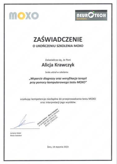 Przeprowadzałem u Pani Alicji diagnozę ADHD (MOXO oraz DIVA-5). Współpraca przebiegała w Miłej atmosferze.