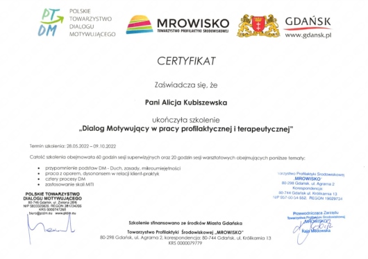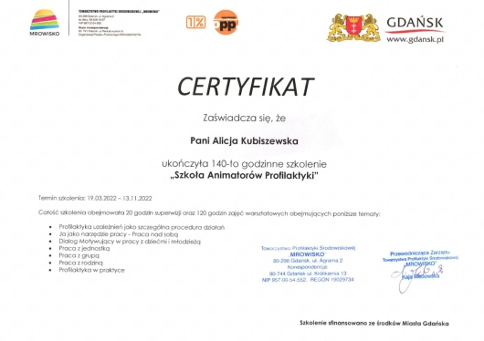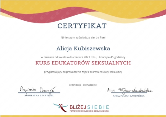 Znajduję się na liście rekomendowanych specjalistów stworzonej przez Stowarzyszenie Asfera. Jestem członkinią Polskiego Towarzystwa Seksuologicznego. Regularnie kształcę się oraz poszerzam swoją wiedzę uczestnicząc w szkoleniach oraz konferencjach.
