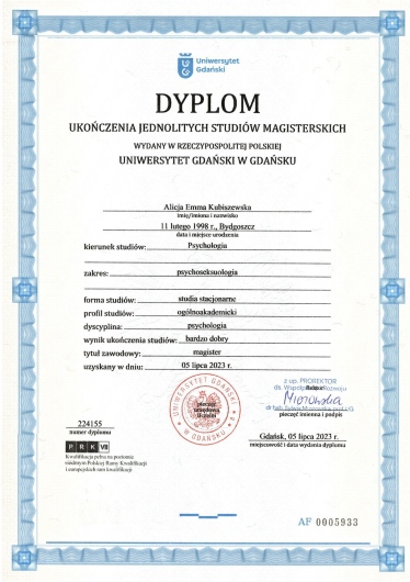 Ukończyłam jednolite studia magisterskie z psychologii ze specjalnością z psychoseksuologii na Uniwersytecie Gdańskim oraz seksuologię kliniczną na Uniwersytecie SWPS w Sopocie.Obecnie jestem w trakcie 4-letniego szkolenia specjalizacyjnego z psychoterapii poznawczo-behawioralnej.