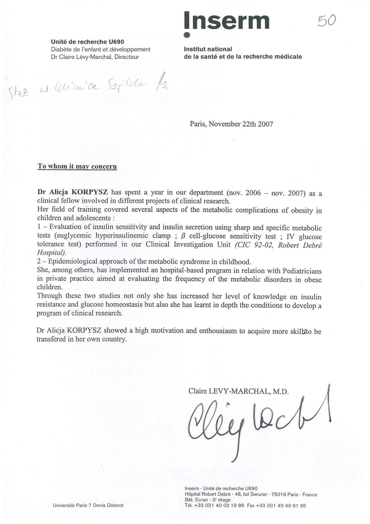 Staż naukowy - INSERM UNIT 690, Hôpital Robert Debré – Prof Clare Levy Marchal, Paryż (11.2006-11.2007) (Badania – insulinooporność u dzieci z otyłością, terapia leptyną -wrodzonej lipodystrofii, klamra euglemiczna )