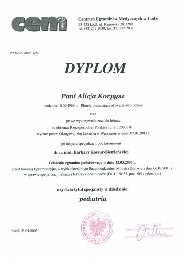 Jaki jest zakres porad oferowanych przez Alicja Lidia Korpysz?Alicja Lidia Korpysz to pediatra, endokrynolog dziecięcy, diabetolog dziecięcy. Na podstawie swojego doświadczenia i wykształcenia Alicja Lidia Korpysz oferuje usługi takie jak: konsultacja endokrynologiczna dzieci, Konsultacja endokrynologiczna, konsultacja pediatry dzieci chore, USG tarczycy dzieci, konsultacja pediatryczna.
