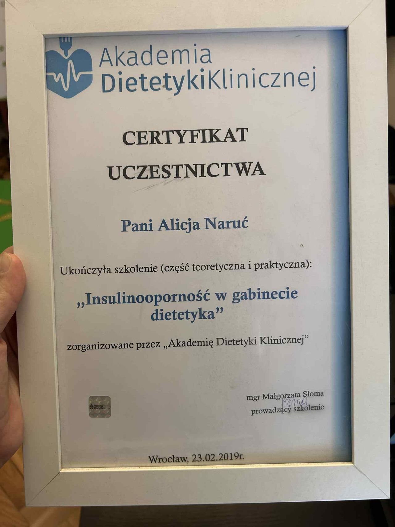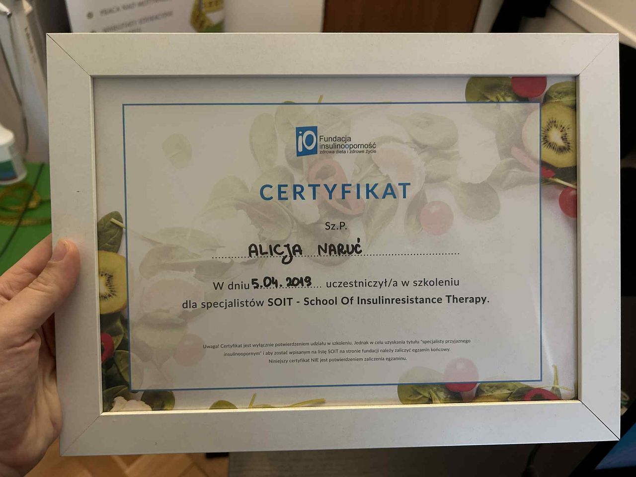 W roku 2019 ukończyłam szkolenie SOIT i aktualnie znajduje się na liście specjalistów polecanych insulinoopornym fundacji Insulinooporność – zdrowa dieta i zdrowe życie.