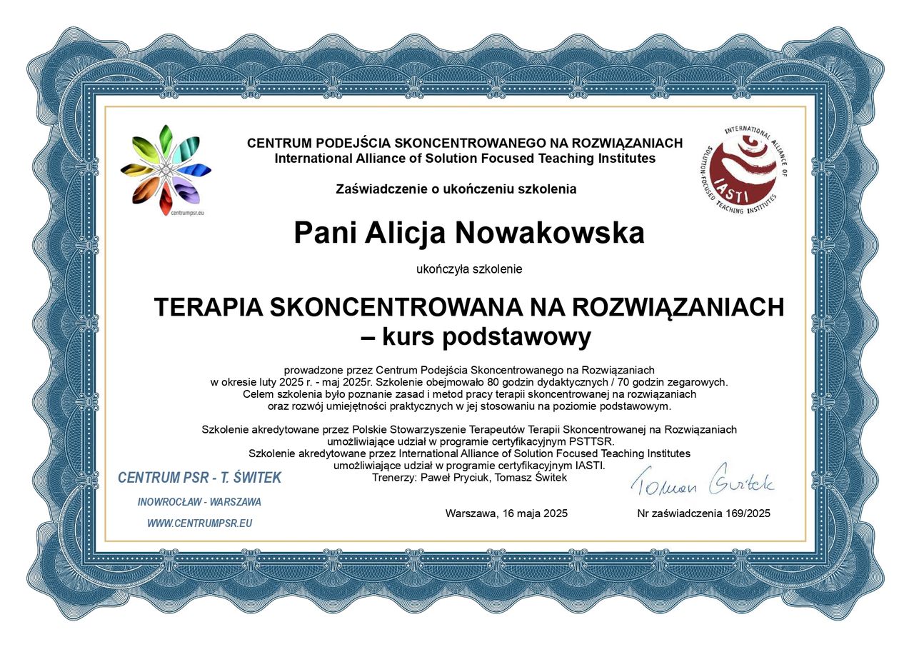 Jestem również terapeutą TSR I stopnia - Terapii Skoncentrowanej na Rozwiązaniach oraz Trenerem TUS I i II stopnia.