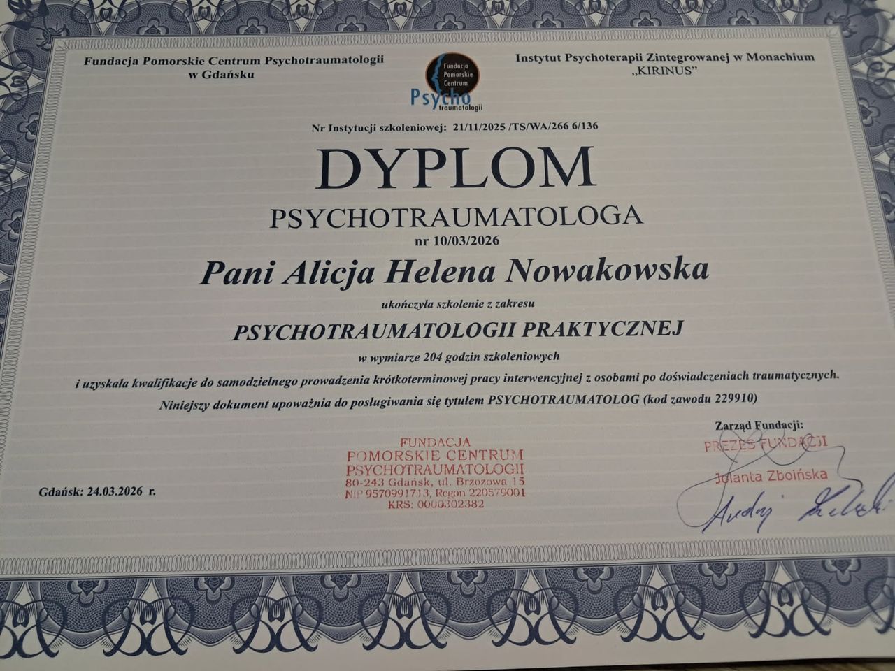 Jestem również certyfikowanym Psychotraumatologiem - szkolenie rekomendowane przez Polską Federację Psychotraumatologii, będącą członkiem Polskiej Rady Psychoterapii oraz Instytut Psychoterapii Zintegrowanej w Monachium.
