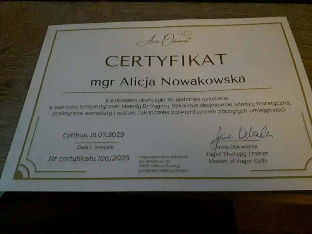 Jestem także Certyfikowanym Terapeutą nowatorskiej i szeroko stosowanej w Europie Zachodniej oraz w Stanach Zjednoczonych Metody Dr Yagera. Jest to metoda pracy polegająca na pracy z lękami, emocjami, traumami bez konieczności głębokiego wchodzenia w bolesne wspomnienia.