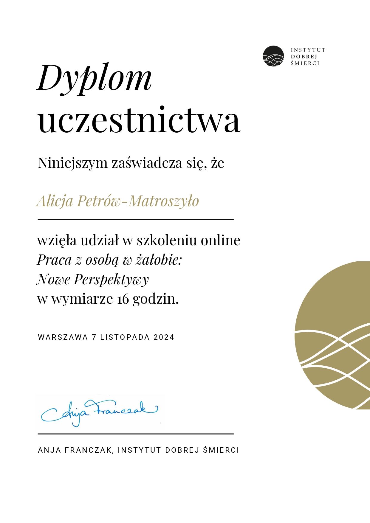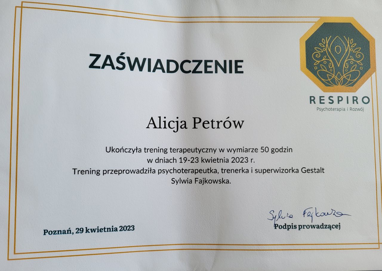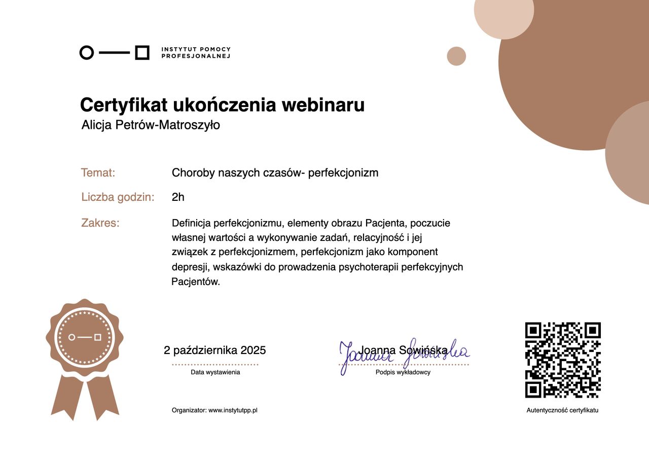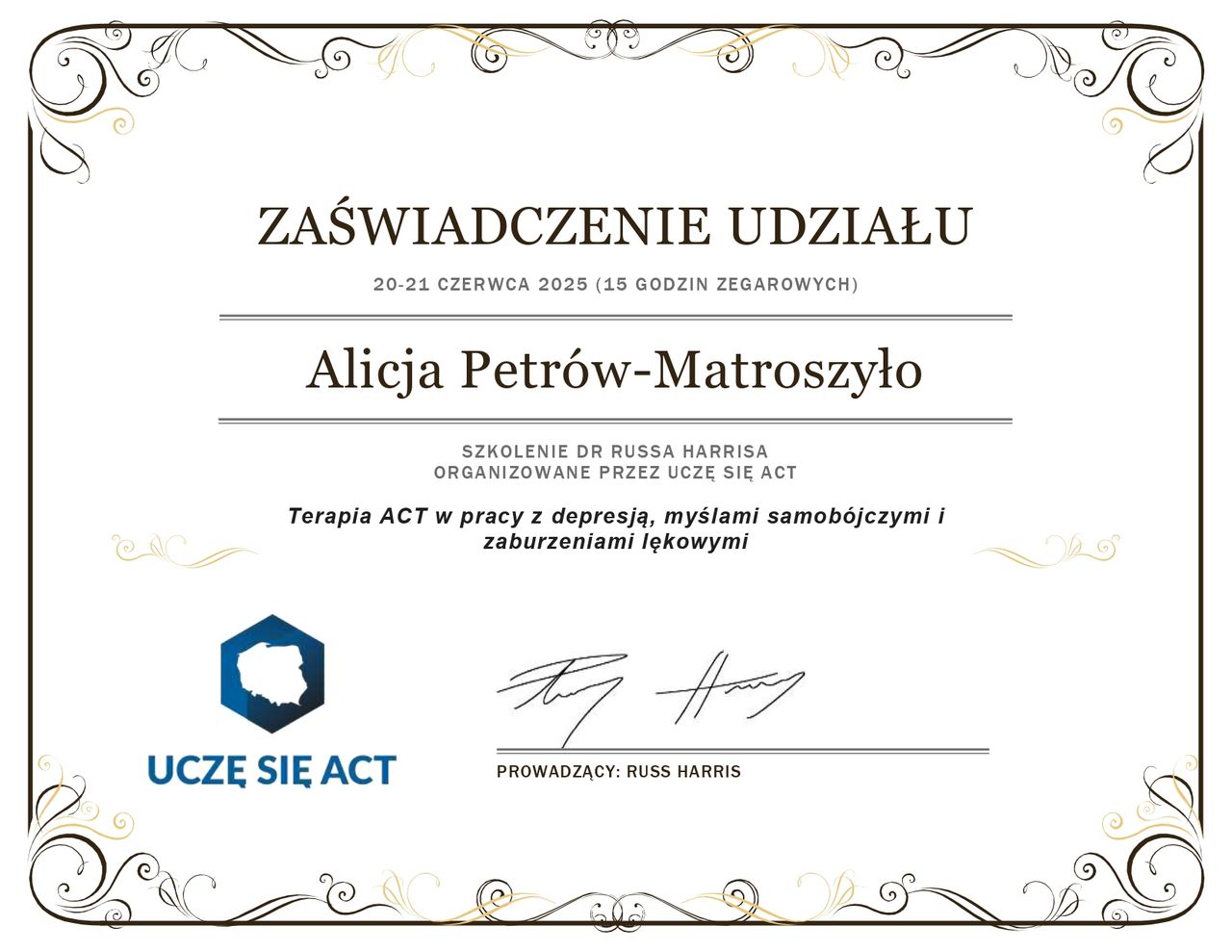 Dzień dobry. Nazywam się Alicja Petrów-Matroszyło, jestem psychologiem i psychotraumatologiem w trakcie specjalizacji. Od kilku lat towarzyszę osobom dorosłym i młodzieży (od 16. roku życia) w procesie odzyskiwania równowagi psychicznej, emocjonalnej i cielesnej.