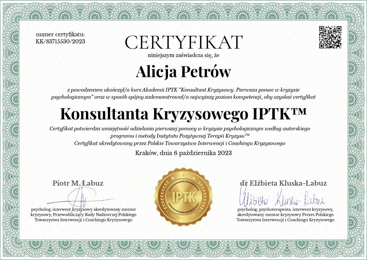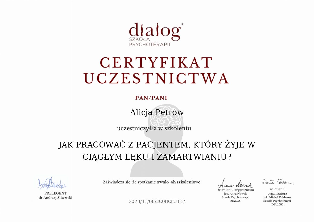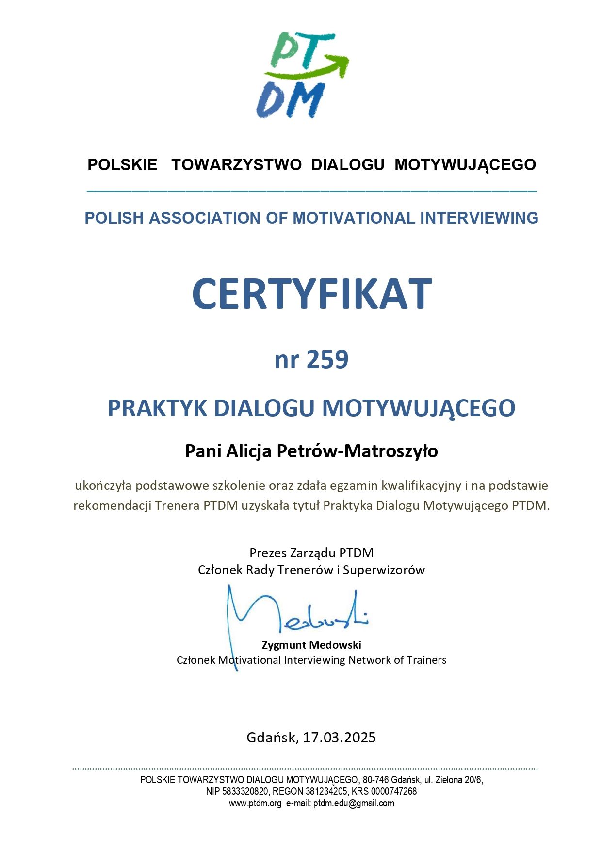 Jestem Praktykiem dialogu motywacyjnego Polskiego Towarzystwa Dialogu Motywacyjnego (PTDM) oraz konsultantką interwencji kryzysowej (akredytacja PTIKK).