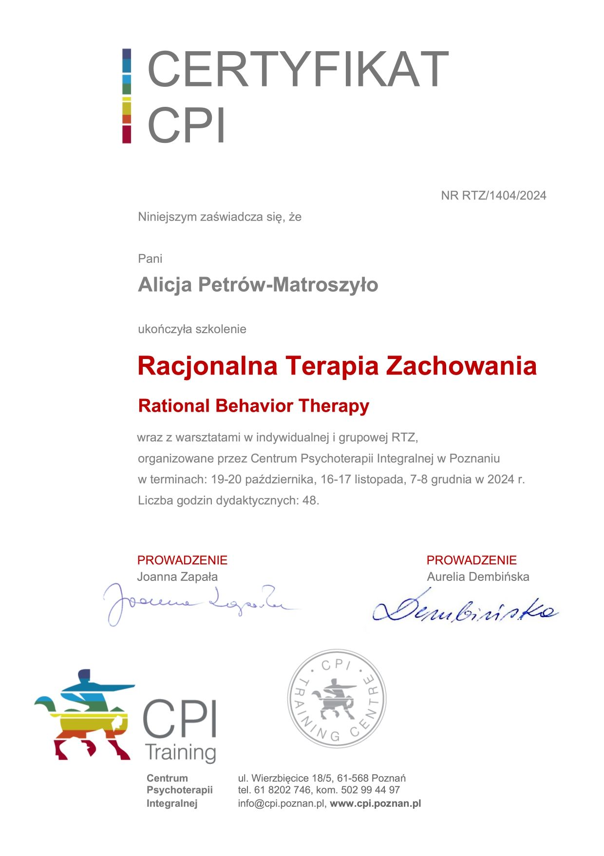 Ukończyłam szkołę Racjonalnej Terapii Zachowania (RTZ), liczne kursy Terapii Akceptacji i Zaangażowania (ACT), szkolenie MBCT-L (Mindfulness-Based Cognitive Therapy – for Life) oraz szkolenie trenerskie pracy z oddechem.