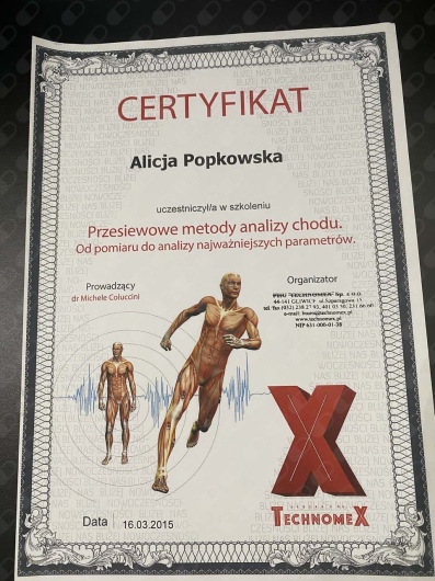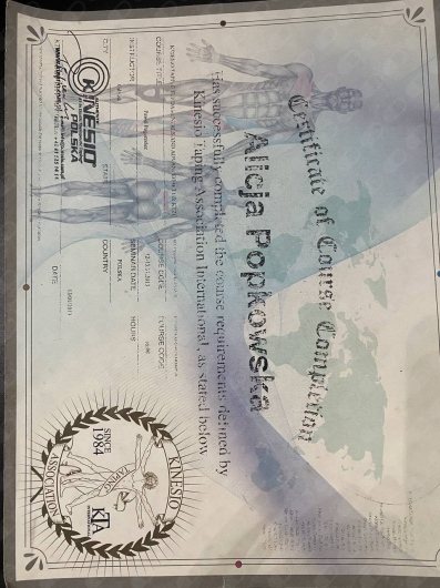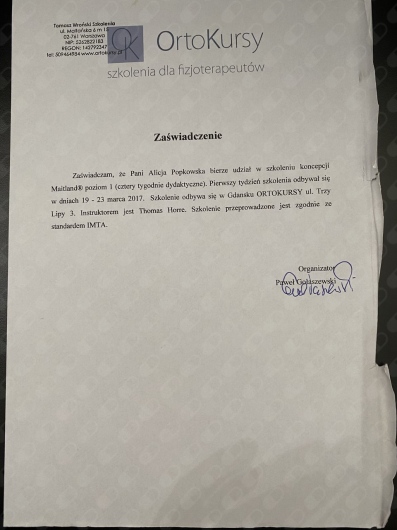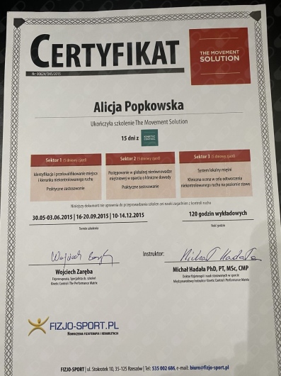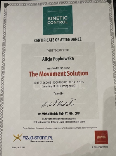 Ukończyłam kurs Kinesiotapingu, Kinetic Control Movement Solution oraz rozpoczęłam kurs terapii manualnej Maitland, który kontynuuję w chwili obecnej.