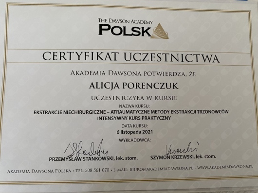 Jaki jest zakres porad oferowanych przez Alicja Porenczuk?Alicja Porenczuk to stomatolog, lekarz wykonujący zabiegi medycyny estetycznej. Na podstawie swojego doświadczenia i wykształcenia Alicja Porenczuk oferuje usługi takie jak: Konsultacja stomatologiczna, Wybielanie zębów, konsultacja endodontyczna, zdjęcia pantomograficzne, Tomografia szczęki i żuchwy, pakiet higienizacyjny, Zdjęcie szwów, Osocze bogatopłytkowe twarz, peeling medyczny PRX-T33, osocze bogatopłytkowe skóry głowy.