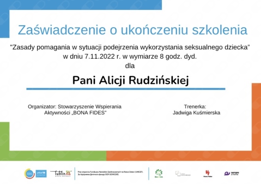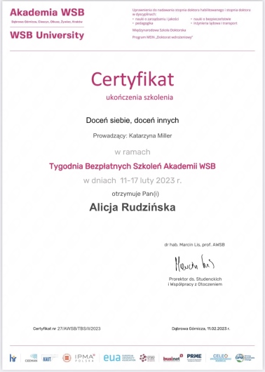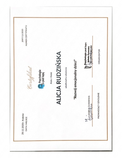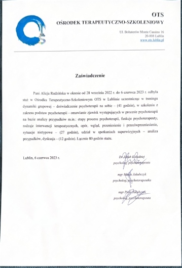 Obecnie pracuję i prowadzę konsultacje psychologiczne oraz psychoterapię w nurcie psychodynamicznym w prywatnym Gabinecie Zdrowia Psychicznego Alicja Rudzińska dla osób dorosłych. Prowadzę konsultacje oraz psychoterapię dla młodzieży i osób dorosłych w Ośrodku Terapii i Diagnozy JASPIK, a także psychoterapię dla młodzieży w Fractal Concept. Piszę artykuły psychologiczne (zakładka: Blog) oraz prowadzę konto na Facebooku: Psycholog Alicja Rudzińska, gdzie można znaleźć treści psychoedukacyjne, materiały do pracy własnej oraz e-booki ćwiczeniowe. Poszerzam swoją wiedzę oraz zdobywam doświadczenie udzielając konsultacji psychologicznych, prowadząc psychoterapię, biorąc udział w regularnej superwizji oraz szkoląc się poprzez udział w kursach edukacyjnych i konferencjach naukowych.