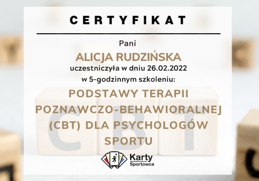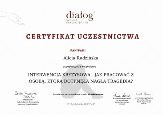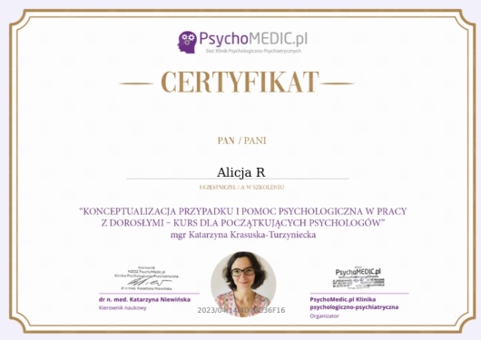 Od samego początku czułam, że jestem w dobrych rękach. Pani Alicja jest bardzo profesjonalna, empatyczna, uważnie słucha i wyciąga niezwykle trafne wnioski, dzięki czemu terapia przynosi nie tylko dobre efekty, ale również rozwija na wielu płaszczyznach. Polecam serdecznie!
