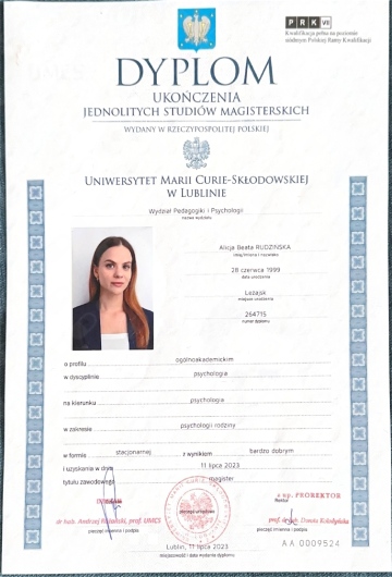Z zawodu psycholog, absolwentka Uniwersytetu Marii Curie-Skłodowskiej w Lublinie, na kierunku psychologia o specjalności rodzinnej. Jestem psychoterapeutką w trakcie czteroletniej szkoły psychoterapii w Krakowskim Centrum Psychodynamicznym, akredytowanej przez Polskie Towarzystwo Psychologiczne (PTP) oraz Polskie Towarzystwo Psychoterapii Psychodynamicznej (PTPP). Podczas pracy terapeutycznej korzystam z technik terapii psychodynamicznej TFP (Transference-Focused Psychotherapy), która bazuje na pracy na relacji terapeutycznej (relacji z obiektem) oraz przeniesieniu – wewnętrznych reprezentacjach obiektów pacjenta, które przenoszone są do relacji pacjent-terapeuta. Rozpoczęłam naukę na Uniwersytecie SWPS z seksuologii klinicznej.