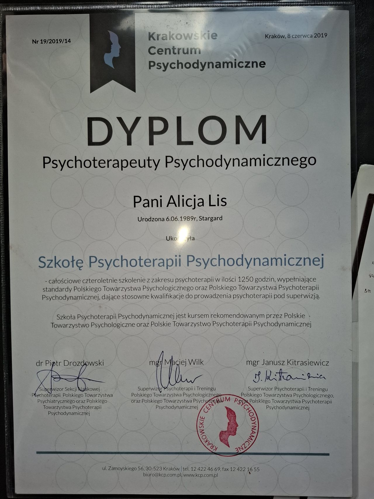 Jestem psychologiem oraz psychoterapeutą psychodynamicznym. Swoją wiedzę zdobywałam podczas studiów psychologicznych na Uniwersytecie Szczecińskim oraz w Krakowskim Centrum Psychodynamicznym. Od 8 lat pracuję jako psycholog oraz psychoterapeuta. Doświadczenie zawodowe zdobywałam w trakcie pracy na Oddziale Dziennym Leczenia Zaburzeń Nerwicowych Szpitala MSWiA w Szczecinie oraz Przychodni Zdrowia Psychicznego gdzie prowadziłam psychoterapię indywidualną oraz grupową. Pracuję z klientami borykającymi się z różnymi trudnościami oraz kryzysami psychologicznymi, depresją, brakiem sensu życia, konfliktami rodzinnymi i w związkach, a także zaburzeniami osobowości. W swoim warsztacie pracy koncentruję się na relacji pomiędzy pacjentem a terapeutą, dzięki czemu pacjent może doświadczyć w gabinecie leczącego go doświadczenia. Nurt psychoterapii psychodynamicznej wywodzący się z psychologii głębi sięga nieuświadomionych treści i w nich poszukuje przyczyn przeżywanego cierpienia. Wciąż poszerzam swoje doświadczenie zawodowe uczestnicząc w kursach specjalizacyjnych oraz sympozjach naukowych. swoją pracę poddaje regularnej superwizji u certyfikowanego superwizora z zachowaniem zasady anonimowości klienta.