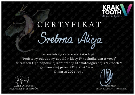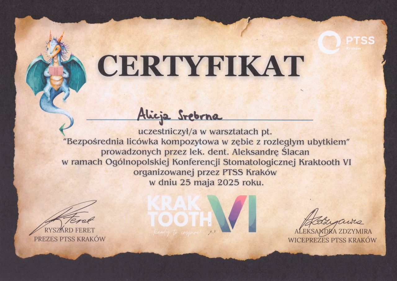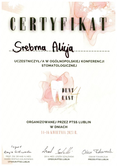 Super podejście do pacjenta, możliwość wyboru leczenia, profesjonalna i przyjazna atmosfera. Delikatny przegląd zębów, który wreszcie mnie nie przeraża. Wizyta przebiegła bardzo miło a sama usługa była wręcz ekspresowa. Polecam Panią stomatolog Alicję Srebrną jak i całą placówkę.