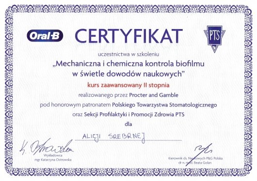 Bardzo polecam Panią Alicję - szczegółowo wszystko wytłumaczyła, zaproponowała plan leczenia, za wczasu poinformowała też o wszystkich kosztów. Będę wracał!