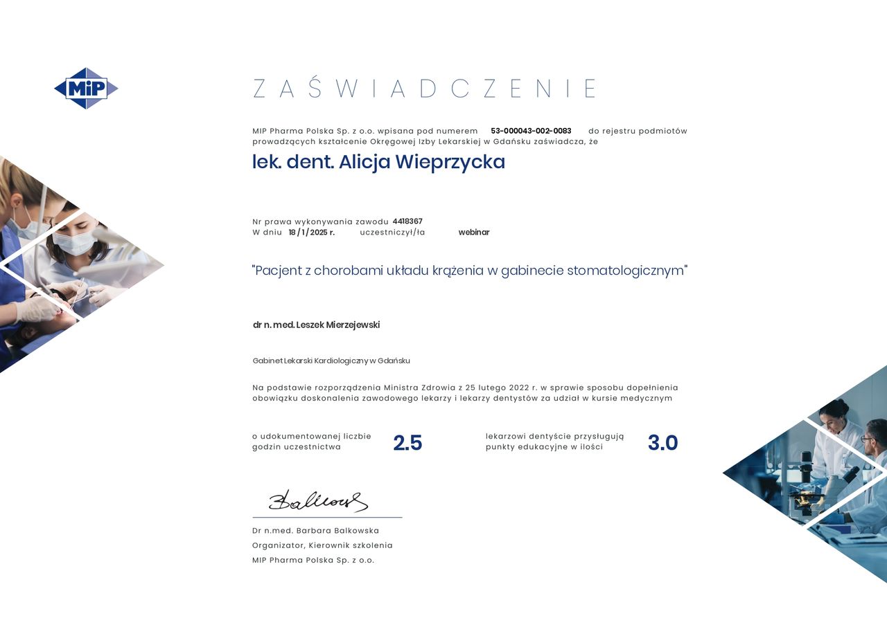 W mojej pracy stawiam na dokładność i staranność. Zależy mi, aby pacjent czuł się bezpiecznie i świadomie uczestniczył w leczeniu – dlatego zawsze wszystko szczegółowo tłumaczę. Mam doświadczenie w pracy z pacjentami, którzy odczuwają silny lęk przed wizytą u dentysty, a w razie potrzeby wykonuję zabiegi z użyciem podtlenku azotu (tzw. gazu rozweselającego), co dodatkowo zwiększa komfort leczenia.
