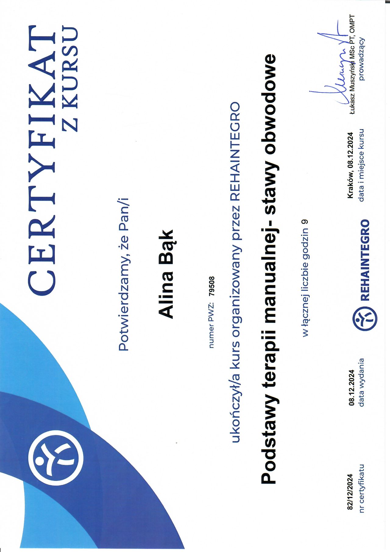 Nieustannie poszerzam swoją wiedzę i umiejętności, uczestnicząc w specjalistycznych kursach i szkoleniach. Dzięki temu mogę oferować terapie dostosowane do indywidualnych potrzeb pacjentów – skuteczne, bezpieczne i prowadzące do trwałej poprawy samopoczucia.