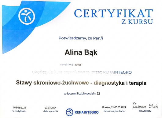 Pani Alina jest bardzo zaangażowana i profesjonalna. Pomogła mi pozbyć się napięć w obrębie szczęki i twarzy. Zdecydowanie polecam!