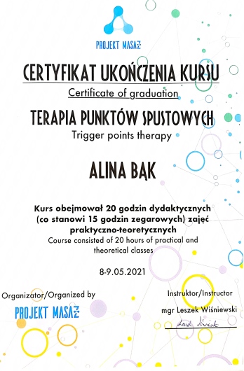 Bardzo polecam wizyty u Pani Aliny wszystkim osobam z dolegliwościami bólowymi mięśni. Dużo pracuję przy komputerze, prowadzę siedzący tryb życia i przez to zmagam się z bolami karku. Po wizytach u Pani Aliny zawsze czuję znaczącą poprawę i odprężenie na długi czas. Do tego Pani Alina zawsze jest miła i uśmiechnięta, uważnie słucha i dokładnie odpowiada na wszystkie pytania.