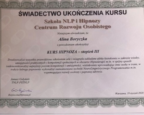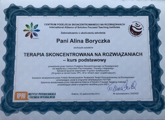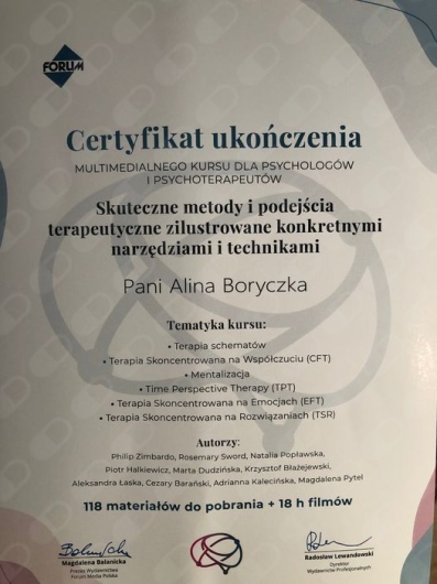 Bardzo polecam, Pani Alina jest osobą profesjonalną, merytoryczną, kompetentną i empatyczną. Potrafi stworzyć atmosferę pełną zaufania, zrozumienia i otwartości.